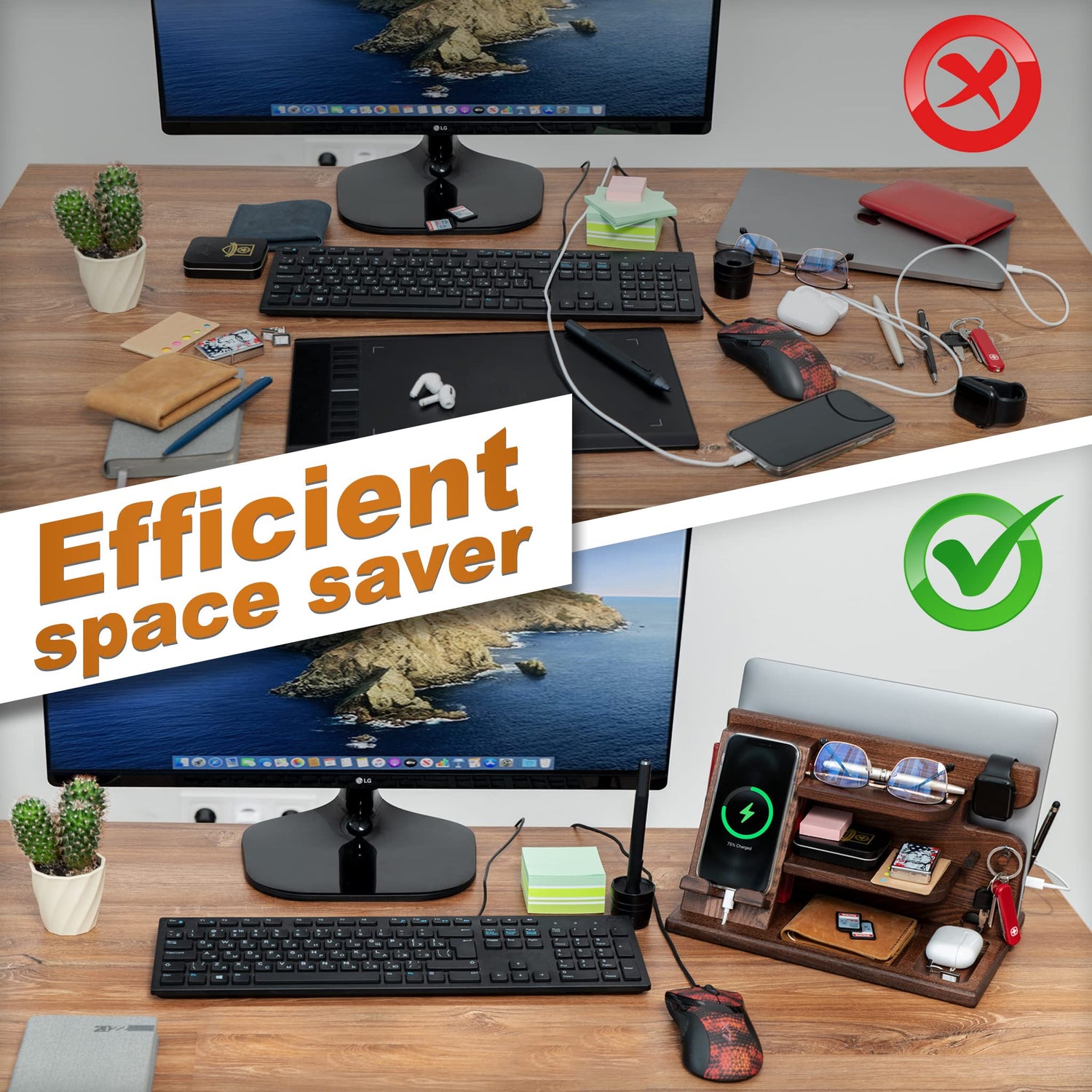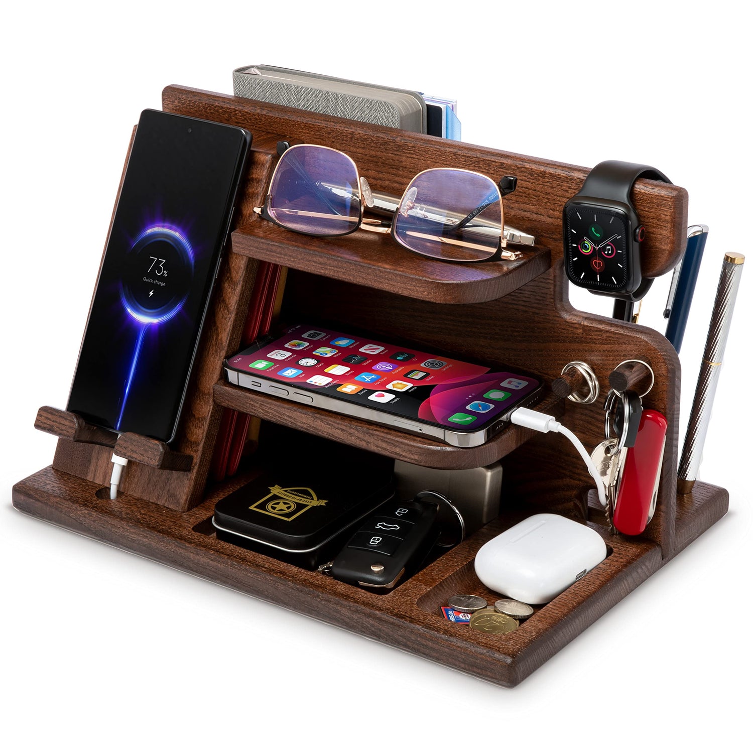 TESLYAR Wood Phone Docking Station for Men - Desktop or Nightstand Organizer - Birthday gifts for Men or Dad - Anniversary Idea from Wife - Key Holders, for Wallet, Watch & Essentials (Chestnut Brown)