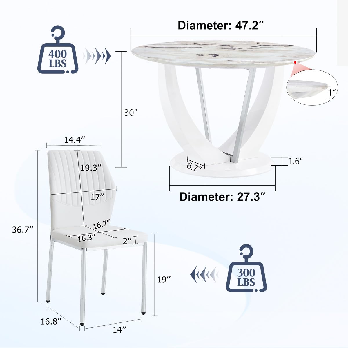 - Sturdy Dinner Table Set for 4:The white glossy pedestal base with metal support enhances both visual appeal and structural stability, supporting up to 400 lbs,the faux marble dining table size:47"L×47"D×30"H. The white dining Chairs hold up to 300 lbs, built for daily use with peace of mind,the armless dining chairs size:36.7“H×16.7"D×16.3"L