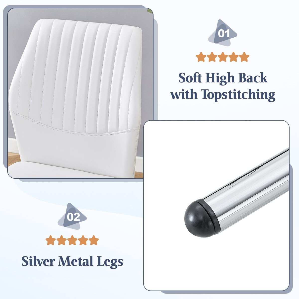 - Armless Dining Chairs Set of 4:The white round dining table set for 4 including the modern armless dining chairs ,and each white and silver dining chair is upholstered with smooth PU leather, paired with a soft high back and foam-filled seat, ensuring lasting comfort,the silver metal legs frame supporting the white dining chairs stable when you sitting on it. The modern circular design blends perfectly with various kitchen or dining room decors