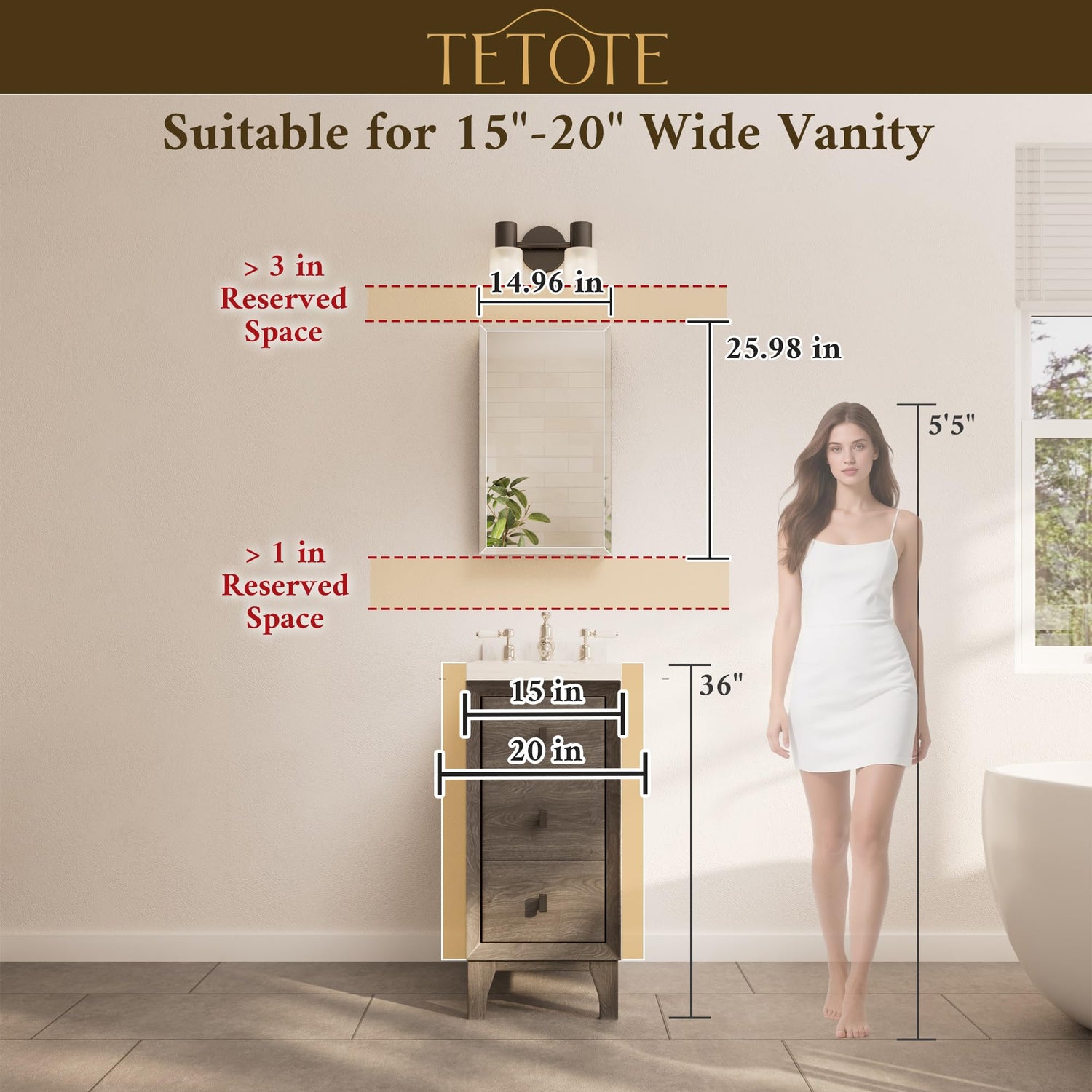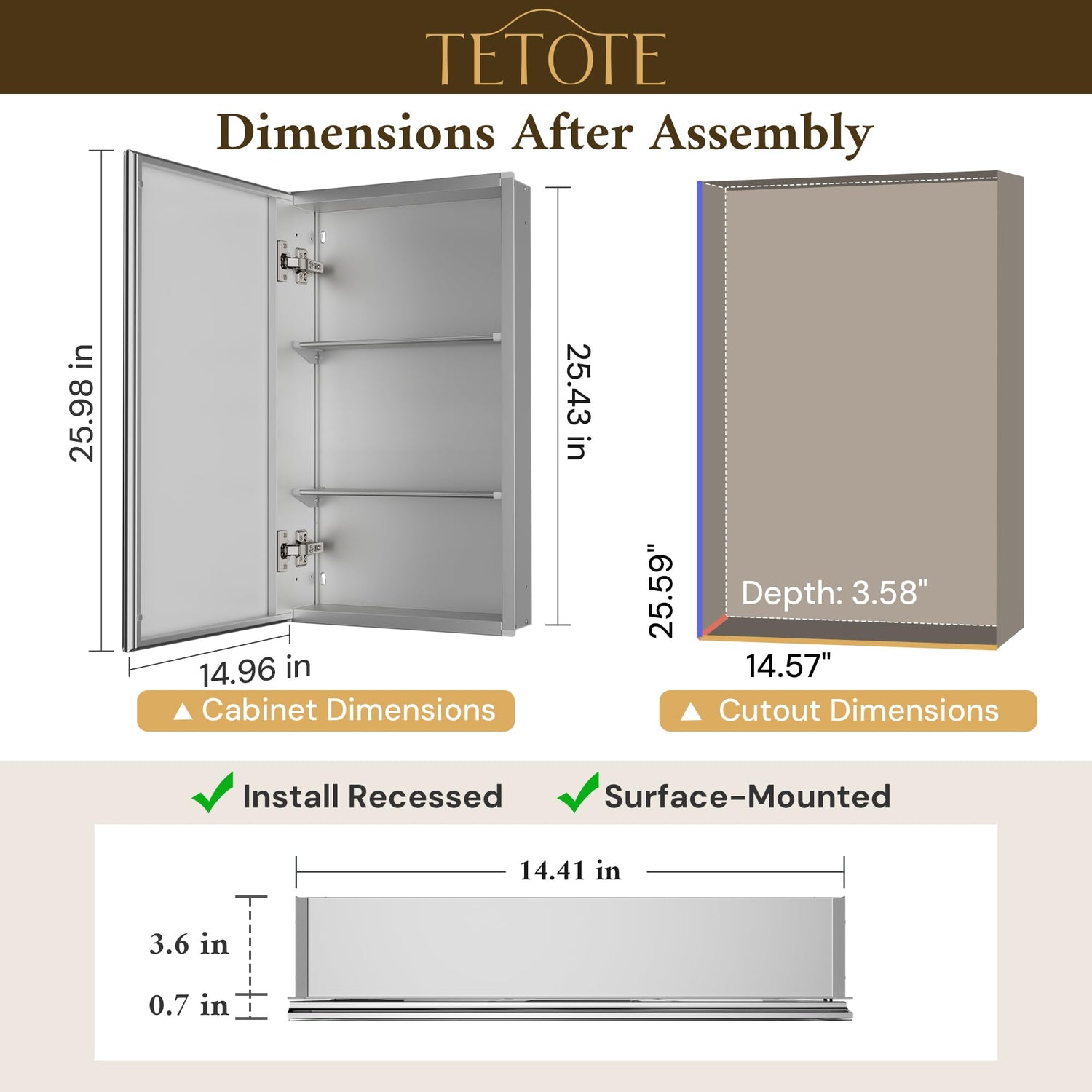 TETOTE 15 x 26 Bathroom Mirror with Storage with Tempered Beveled Mirror Silver Medicine Cabinet Aluminum Cabinet DTC Hinges, Stepless Adjustable Shelves, Recessed/Surface-Mounted