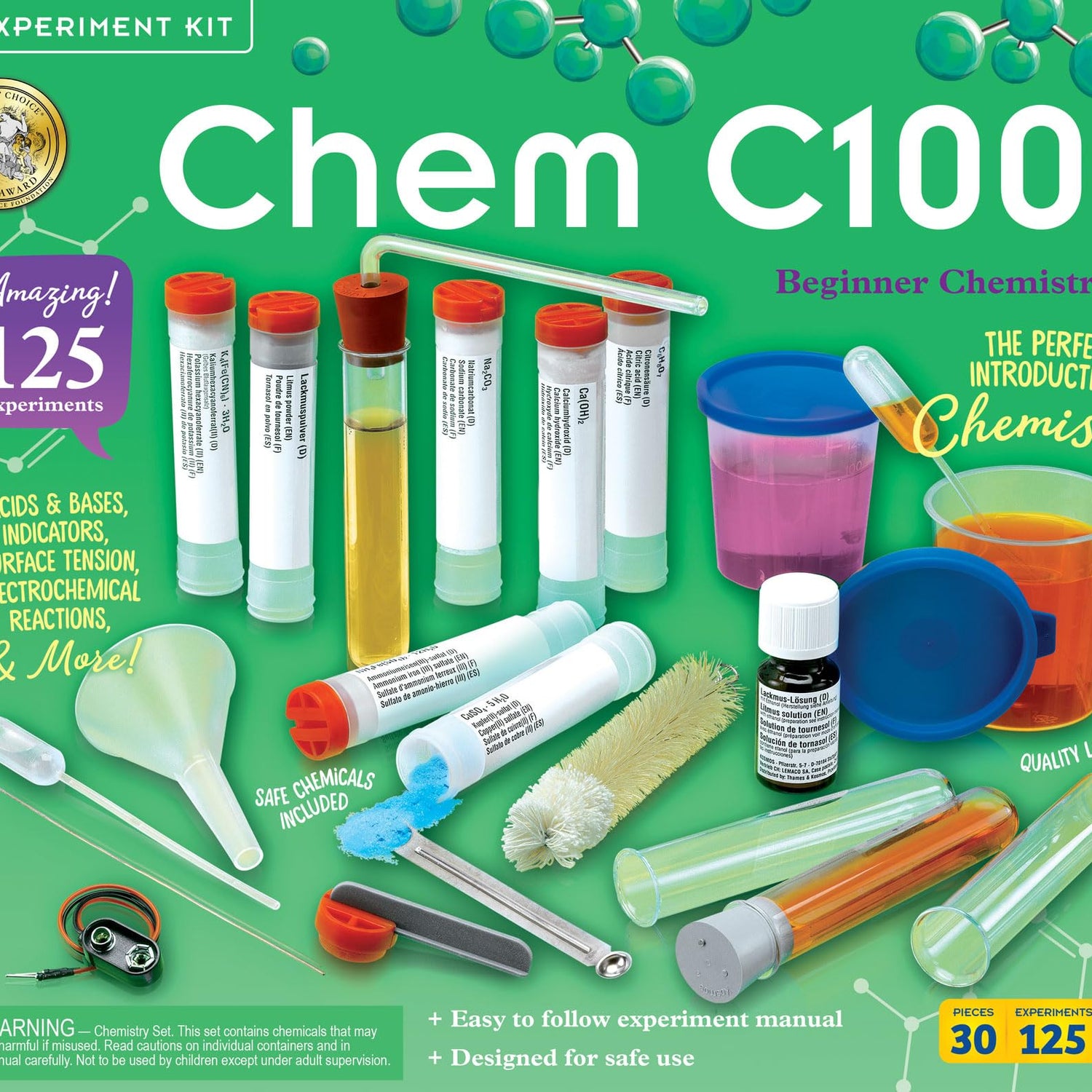 Details: Enroll in Chem C1000 and prepare for a Lifetime of fascination with this essential science through 125 diverse experiments. Start with an introduction to the field of chemistry and famous chemists. Set up your lab space and learn how to safely handle the lab equipment and chemicals. Learn about indicators with litmus solution and write a secret message in invisible ink. Test the inks from your colored markers on the chromatography racetrack to reveal their different color components. Experiment with air pressure, surface tension, and the physical properties of fluids. Thorough safety precautions and instructions ensure safe experimentation. Professional quality equipment helps you make the most of your chemistry experiments.