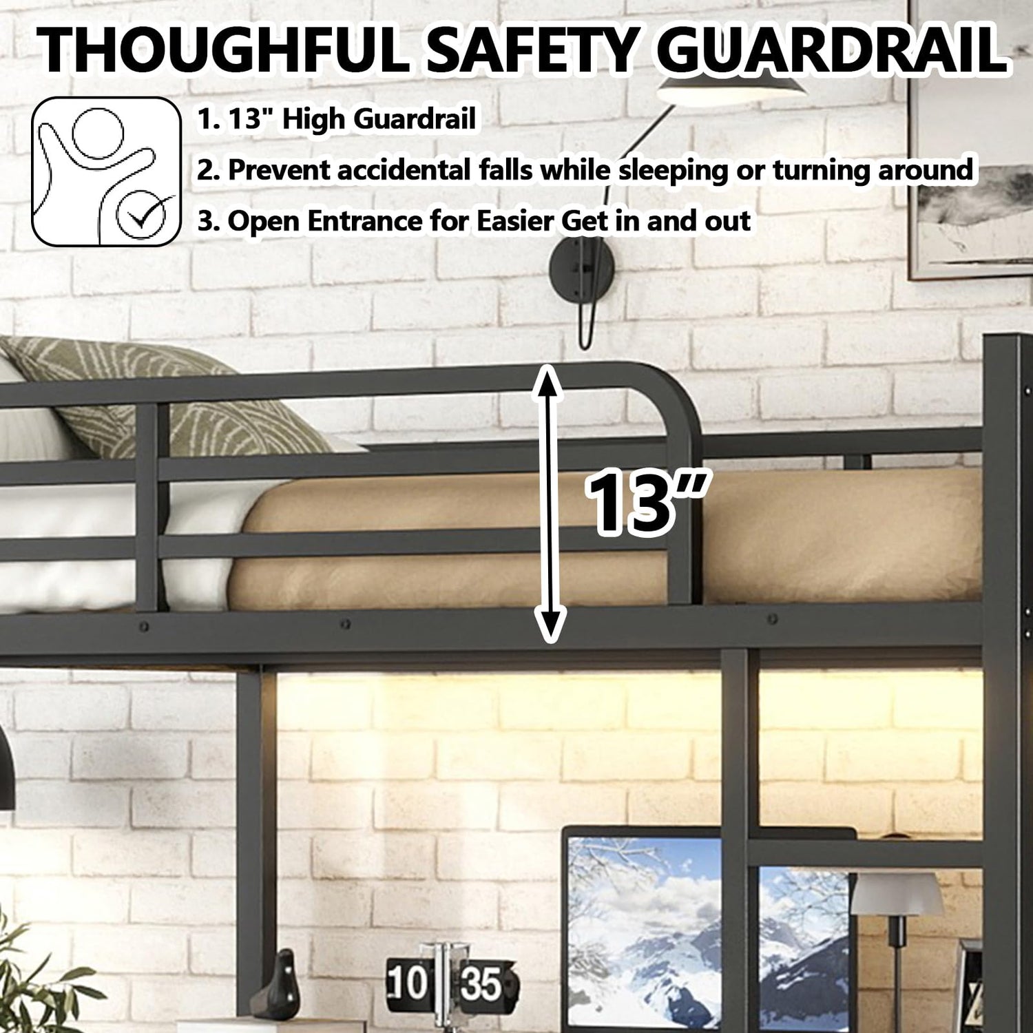 1.Durable Construction Made with thick metal tubes that support up to 350 lbs on the upper bunk Features a full-length guardrail and secure ladder for safe access Reinforced slats prevent squeaking and wobbling during use