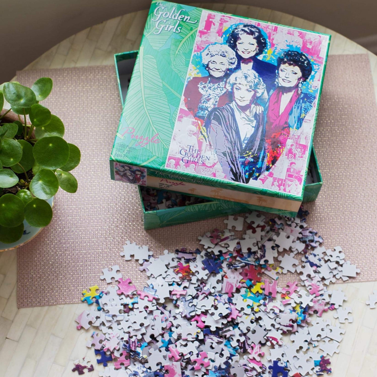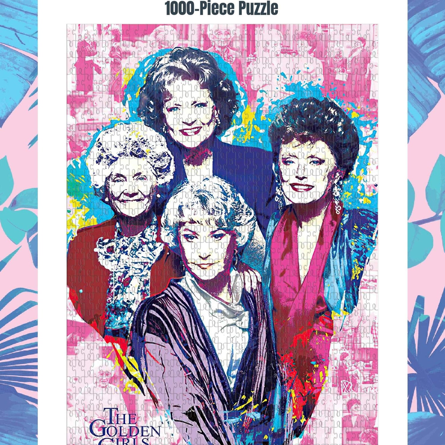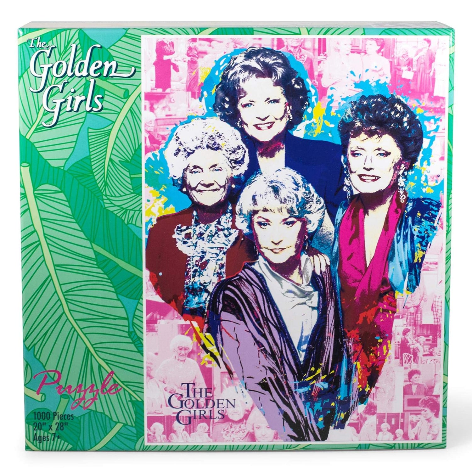 Details: STAY GOLDEN Turn up the sass with this funny Golden Girls puzzle, featuring a retro-style collage of iconic moments from the hit '80s sitcom. Measuring approximately 28 x 20 inches, the completed jigsaw puzzle makes for a fun statement piece. Ideal for putting on display once assembled, show off your masterpiece by framing it for everyone to see. Inspired by the unforgettable wit and charisma of The Golden Girls, the retro-style puzzle is like taking a walk down memory lane with the queens of comedy. A large image of the hilarious foursome takes up a majority of the design, demanding your full attention in true Golden Girls fashion. The puzzle image features a colorful and stylistic design, depicting a fun collage in the backdrop that shows memorable moments from the classic comedy. THE PERFECT FIT Specially made from 100% recycled puzzle board material, the premium construction provides a top-quality building experience. The precision-cut jigsaw pieces are designed to snap easily into place, ensuring a satisfying and seamless interlocking fit. You never have to worry about losing any pieces, which are safely secured inside a bag and packaged in a full-color box that shows you the finished image for solving. Host a family game night or make it a personal challenge to complete this Golden Girls puzzle solo.