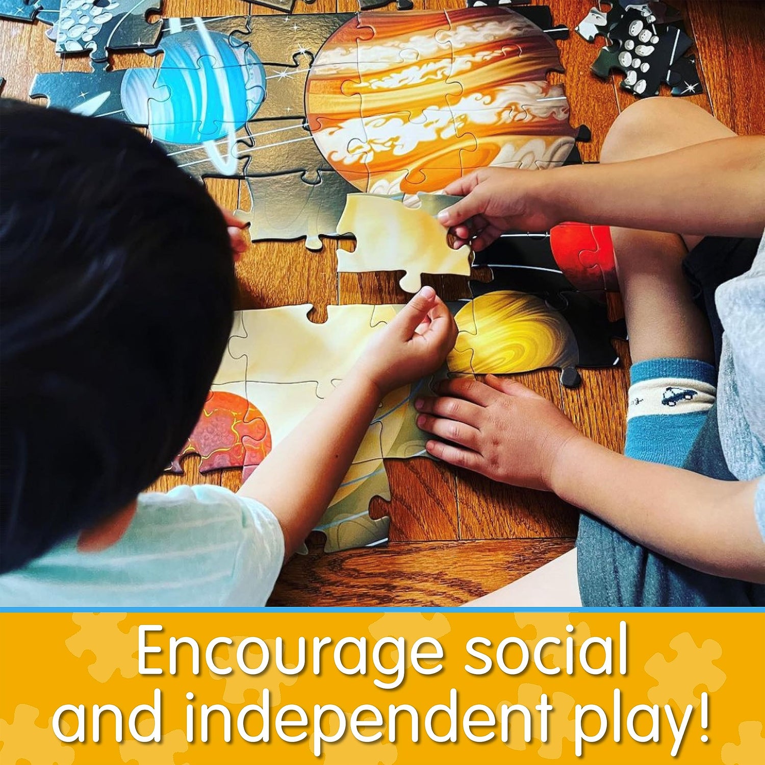 Learning about space has never been so much fun. Expand your knowledge of the solar system with this 100-piece Puzzle Double! After you put the puzzle together, turn off the lights and the puzzle glows in the dark! Additionally, turn the puzzle over and you have a coloring activity. The bright illustrations encourage parent-child conversation. Each 100-piece puzzle measures a giant 3ftx2ft ! Ages 3+ years