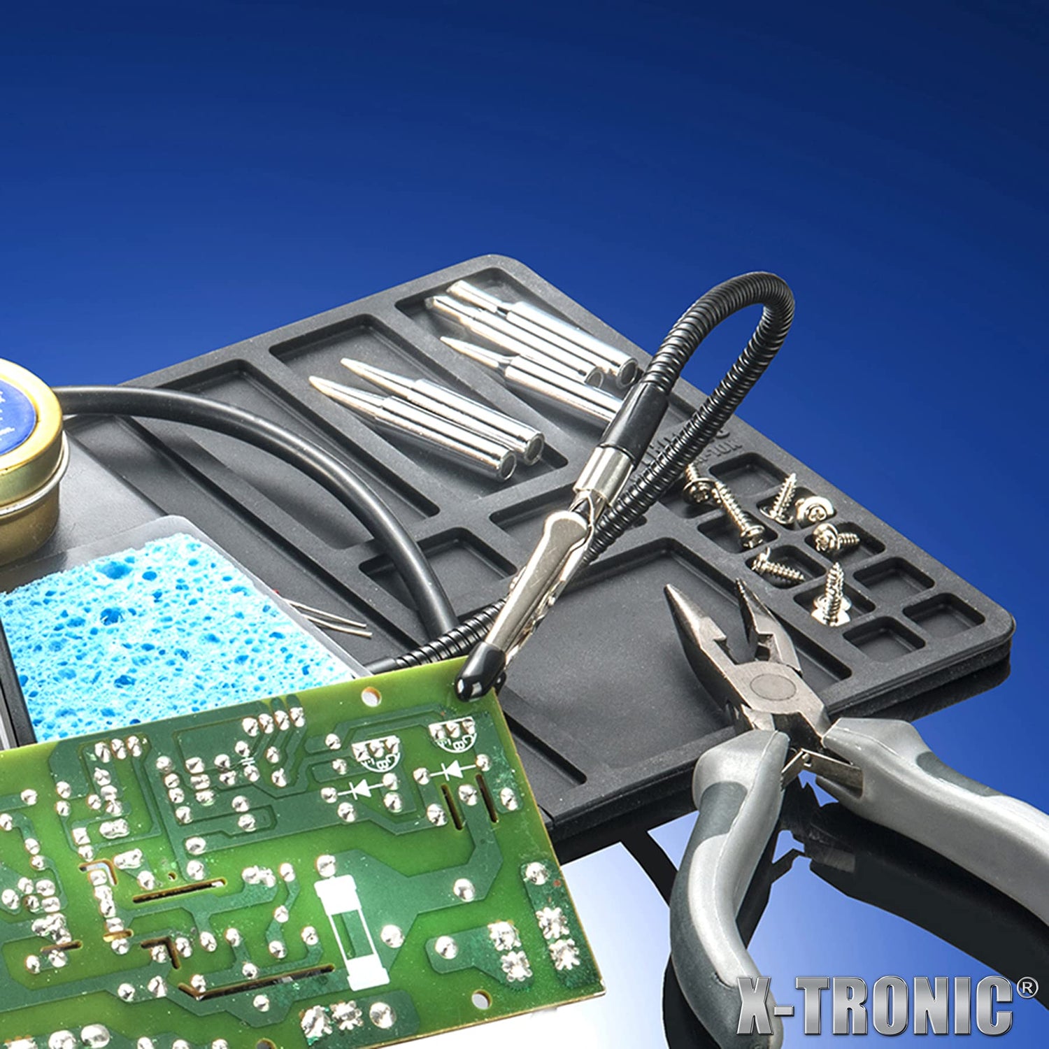 The Original X-Tronic 3020-XTS • 75W Soldering Iron Station Kit • 2 Helping Hands • Silicone Tool Mat • 5 Extra Tips • 50g Roll of Solder • Brass Sponge • Cleaning Flux • C/F Conversion • Auto Sleep!