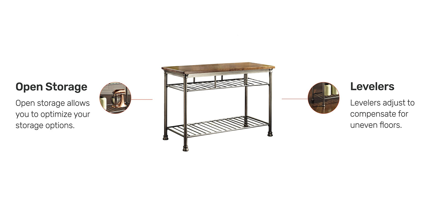 Details: Equal parts industrial and modern, the Homestyles Orleans kitchen island brings everyone together while also keeping everything neatly organized. The upper storage rack is perfect for laying wine bottles on end to protect the cork, while the fixed bottom shelf can hold larger items. The butcher block top can be used as a valuable prep space, or simply as a beautiful way to present a centerpiece.