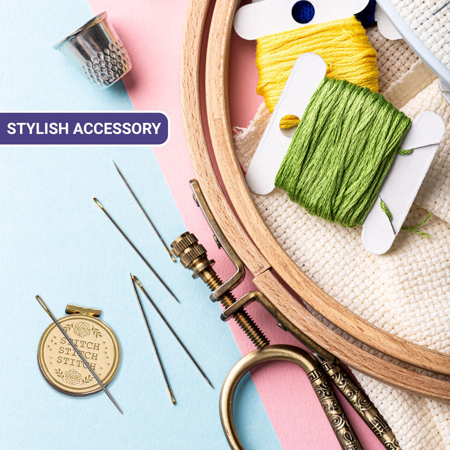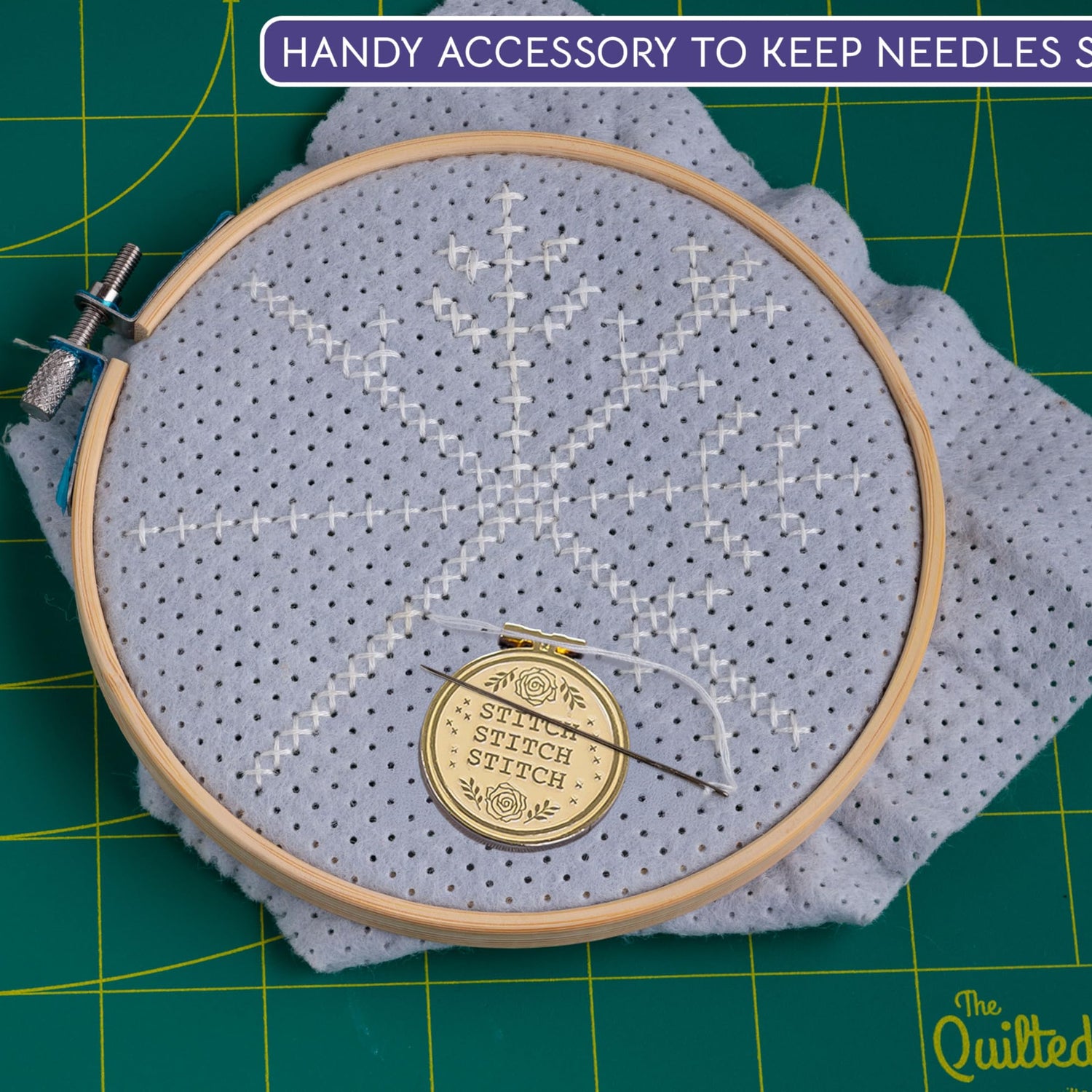 - The enamel sewing needle holder is easily secured to your fabric or embroidery kit. The minder attaches to the front of your fabric with one magnet and secures behind with another.