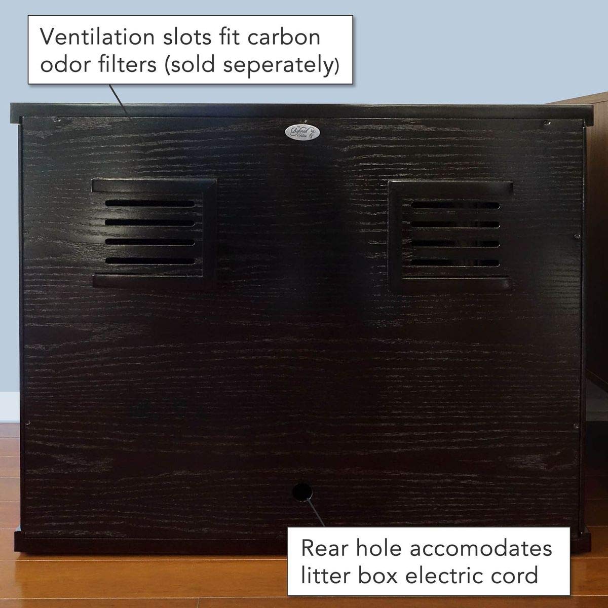 - 🐈 ODOR FIGHTING FEATURES. Ventilation slots at the rear of the litter box cabinet help prevent odor build up. Slots can also hold universal carbon filters to absorb lingering odors (sold separately).