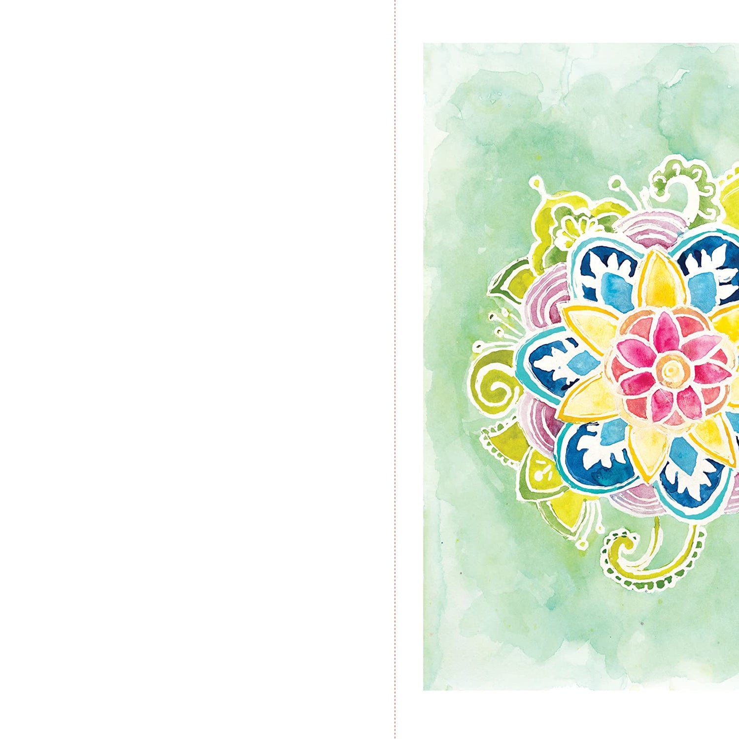Each of the first two Reverse Coloring books—with over 205,000 copies in print in just a year—frees the imagination and encourages the user to be calm and creative. But Mindful Journeys takes it one step further with 50 new and original watercolors created specifically to promote mindfulness. Abstract compositions in calming blues and greens. A shower of circles that suggests the infinity of the sky. Swirls of flowery patterns that evoke mandalas. Spiritual symbols, like a yin-yang, a hamsa hand, a flaming heart. Watery waves, and a curling peacock feather.
