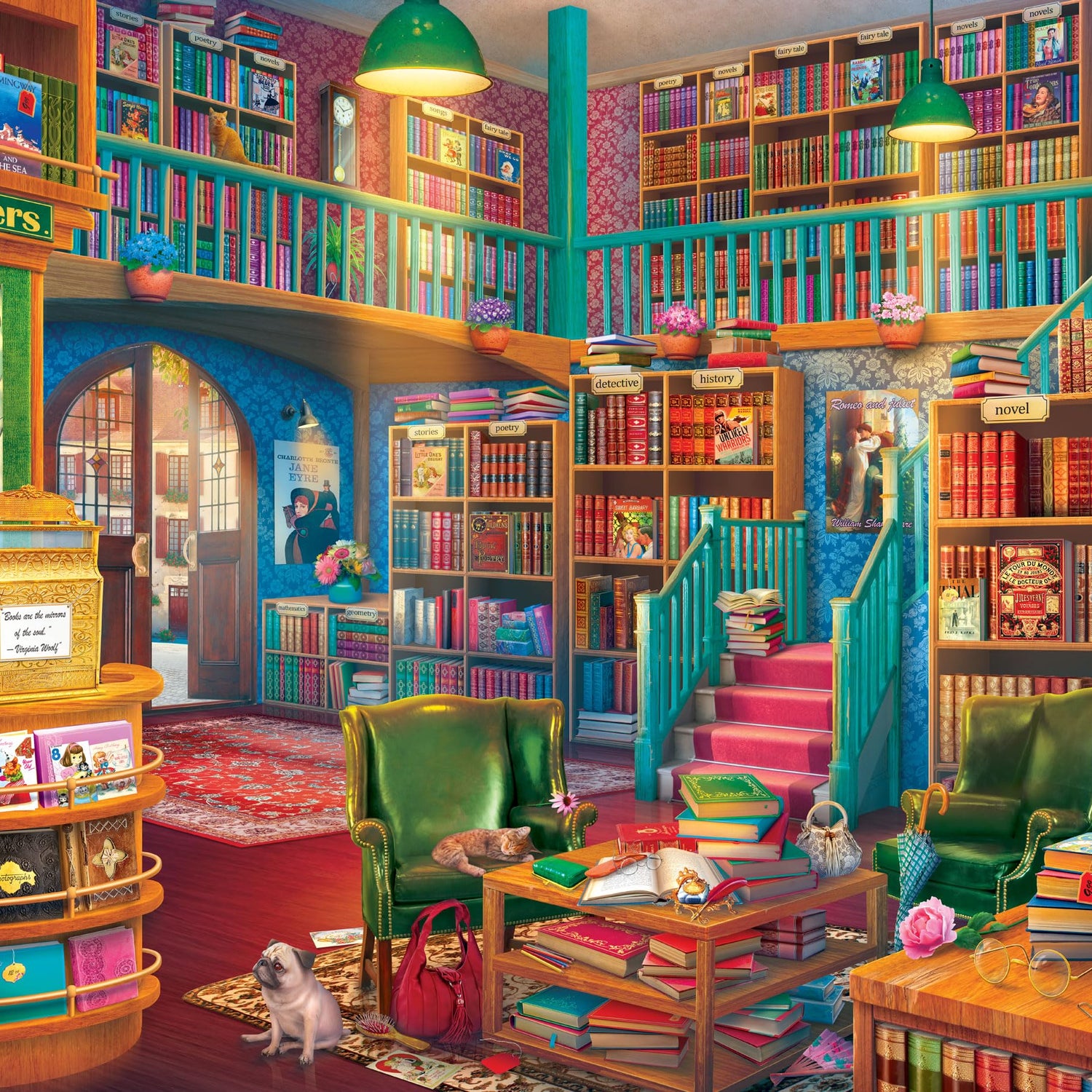 Details: Have a seat and relax awhile in this magical bookshop! What's your pleasure? History, Mystery, Fantasy, or Poetry? Curl up with a book and a bookstore cat (or dog)! Get lost in this beautiful bookstore puzzle! Watch the vibrant scene come together, piece by piece! 500 precision-cut pieces fit snugly. Linen-textured surface reduces glare. Durable premium blue puzzle board. High-resolution puzzle image features rich, sharp, vivid color. Full-sized, full-color poster of finished puzzle included for your reference. Hours of fun! Finished puzzle measures 28'' wide x 20'' high. Sturdy, full-color puzzle box measures 9-1/4'' square x 2'' deep. Warning: Choking hazard. Small parts. Not for children under 3 years.