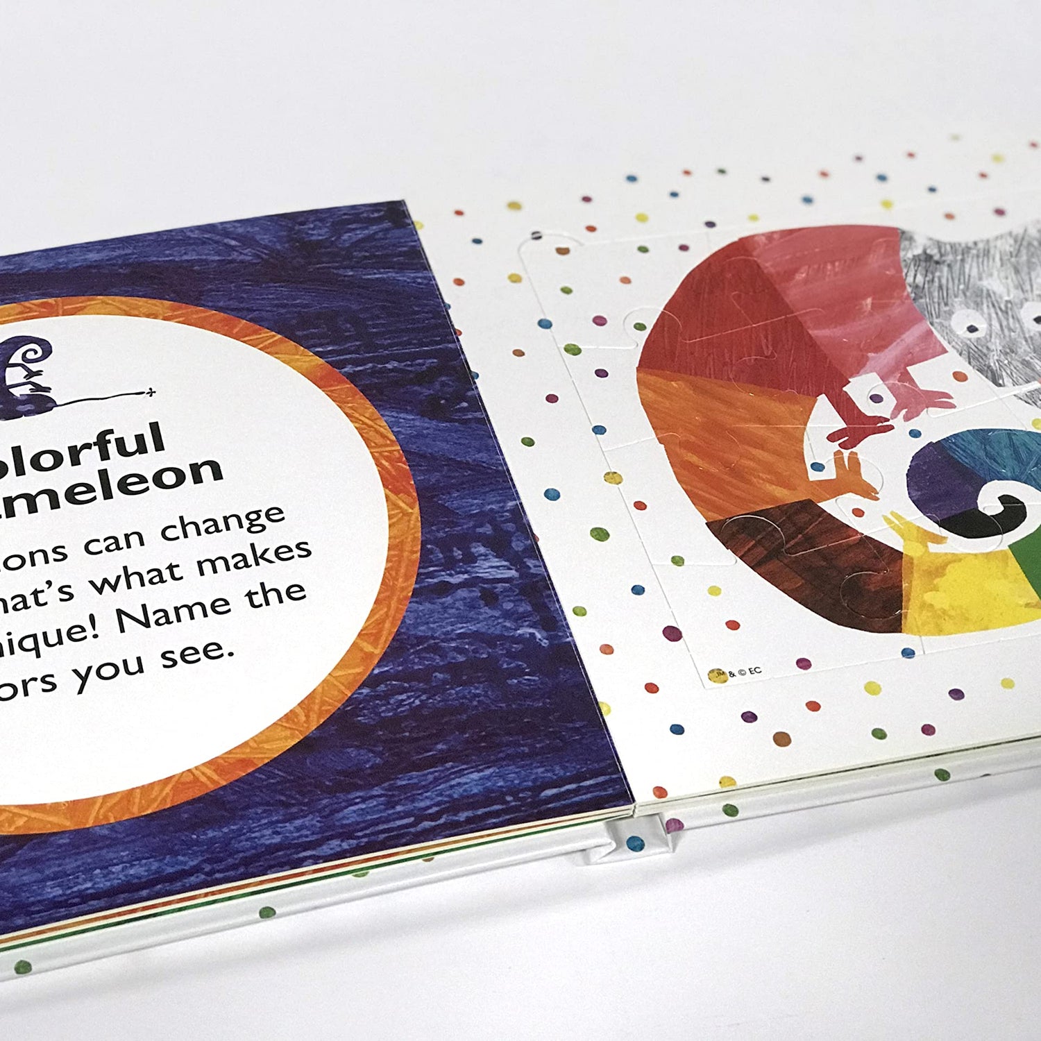 Details: Engage young minds with Eric Carle My First Puzzle Book, an interactive delight for curious learners! This Children's puzzle book is a unique set that combines the joy of reading with hands-on puzzle play. This set includes a padded board book and five engaging puzzles, each consisting of nine sturdy pieces designed for little hands.