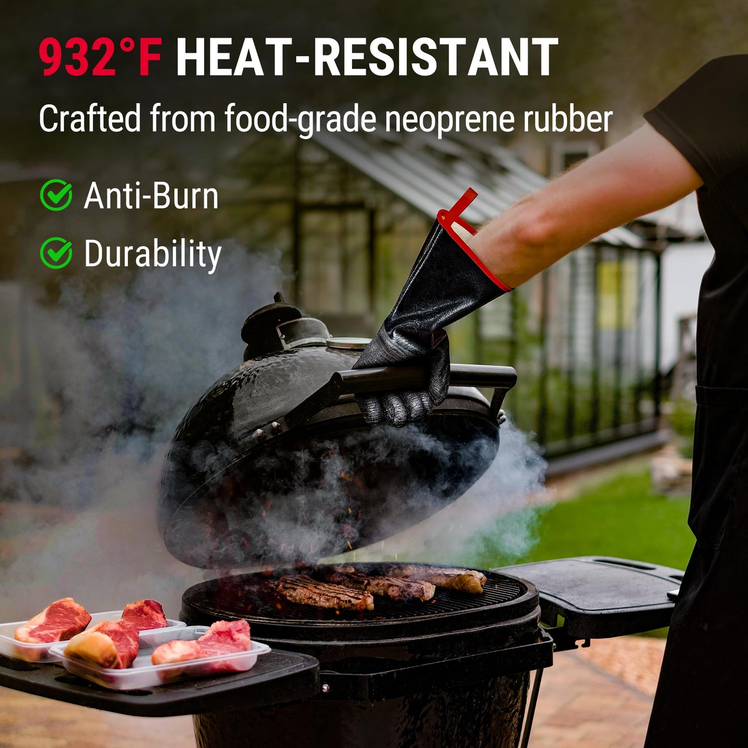 - 【932°F Heat Resistance】Crafted from 100% food-grade neoprene for withstanding heat up to 932°F, these heat gloves for cooking offering protection from direct contact with high-temperature cookware or food, preventing burns and ensuring safe handling during grilling or cooking