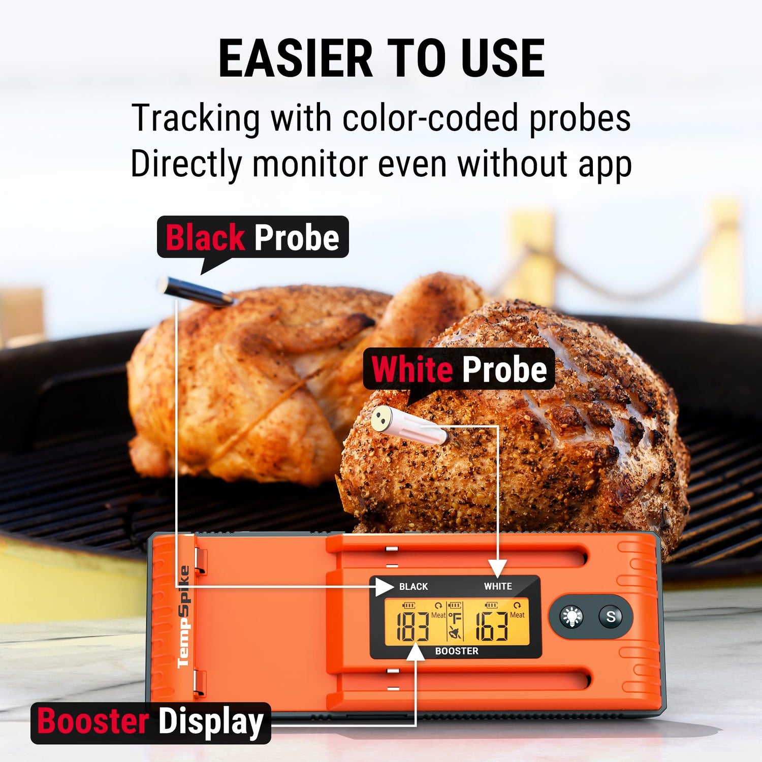 - 【Easier Monitor with LCD-Enhanced Booster】Check ambient and meat temperatures directly on the Booster display—no app needed; The bluetooth thermometer's backlit LCD ensures clear visibility, even in low-light conditions, making cooking effortless