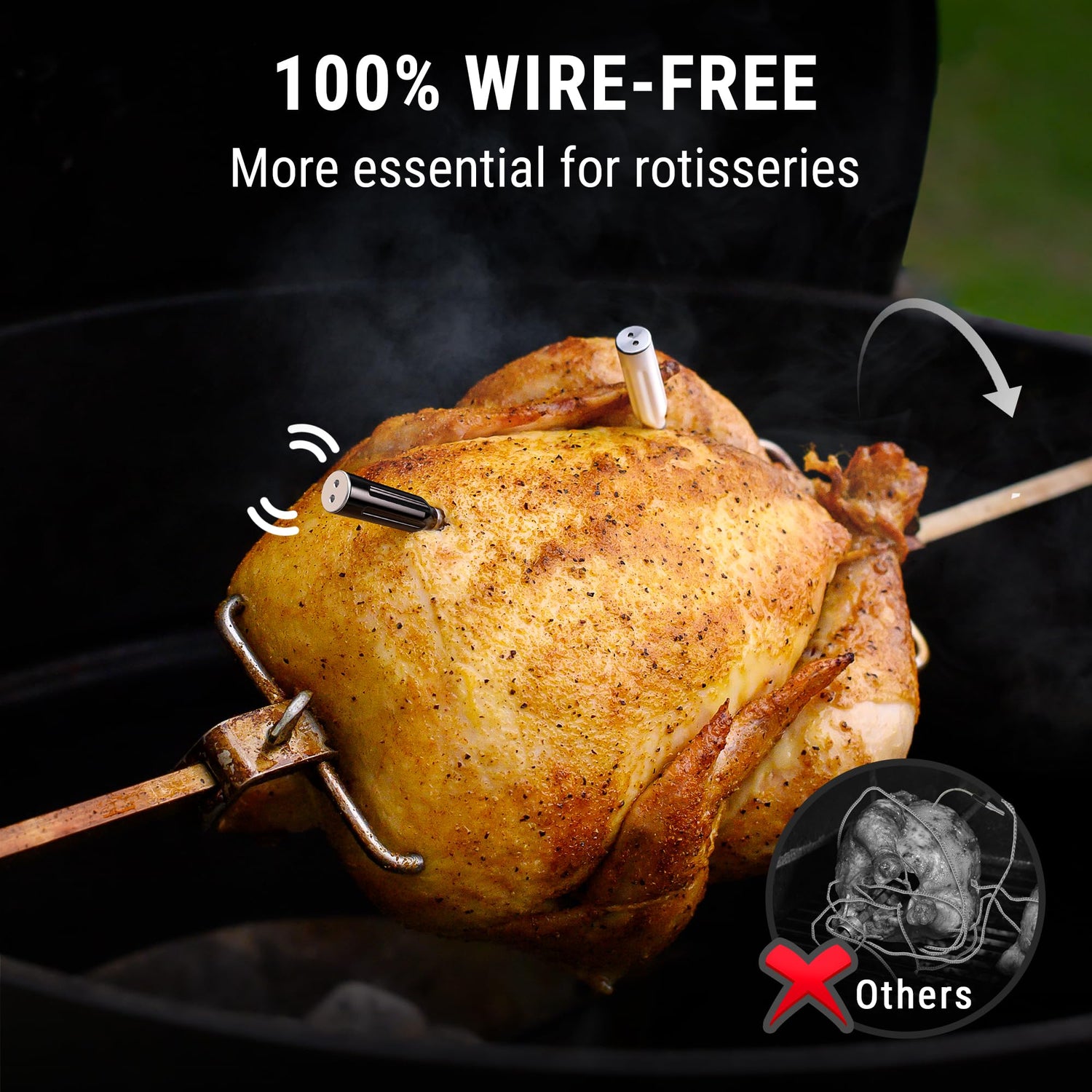 - 【100% Wire-Free】Unlike other wired bbq thermometers, this bluetooth meat thermometer wireless completely cord-free, ideal for use with rotisserie, oven, grill, or smoker, delivering effortless cooking precision