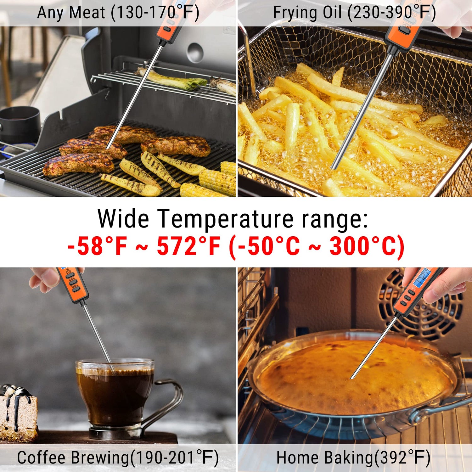 - Wide Variety of Uses: Digital meat thermometer for grill with temperature range of -58~ 572degree Fahrenheit (-50~ 300degree Celsius); Celsius/Fahrenheit selector; Perfect meat thermometer for grilling smoker BBQ indoor outdoor cooking