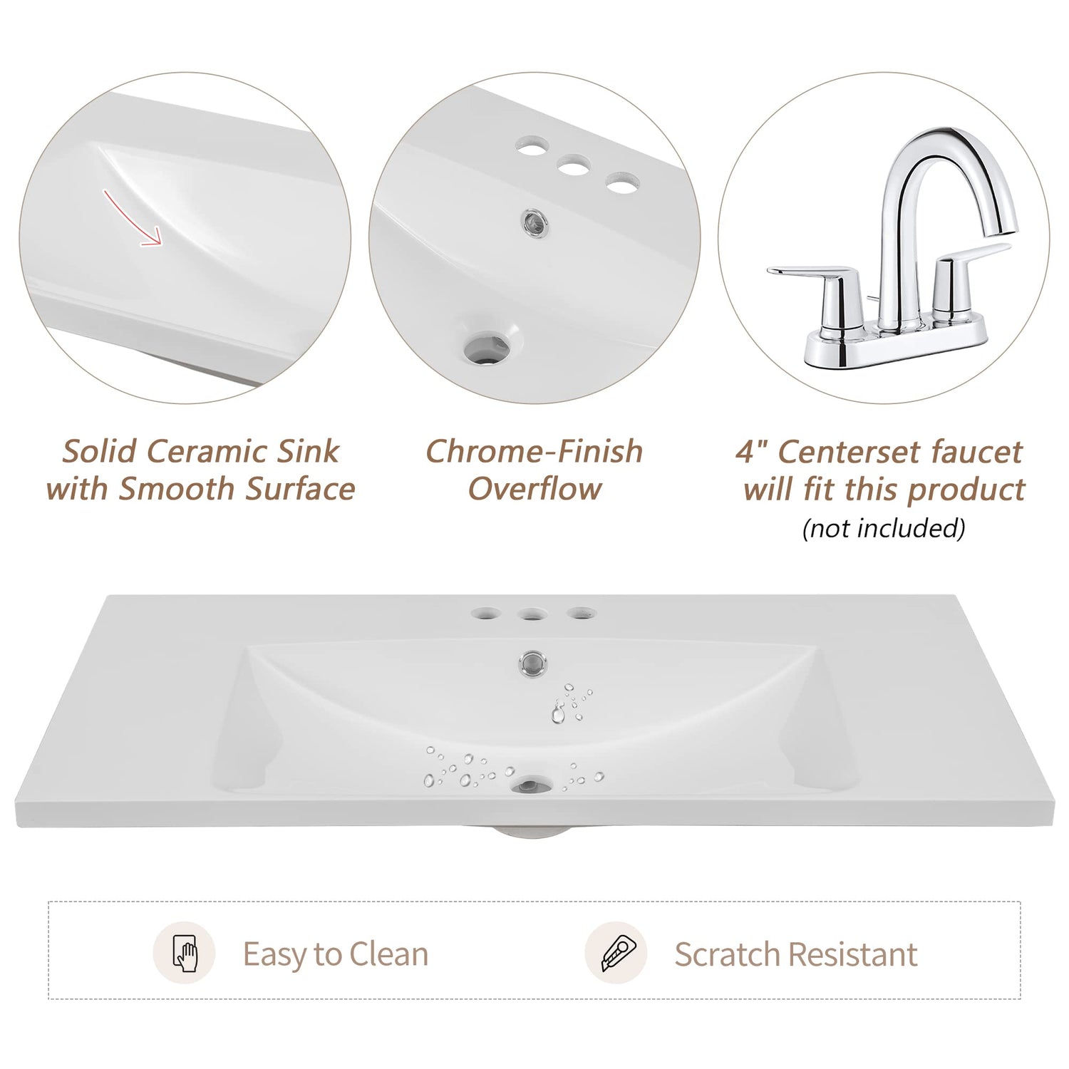 - Ceramic Sink - The elegant white ceramic sink with rounded basin is equipped with an integrated overflow and three hole faucet mount. Half-moon shaped design ceramic sink extends boundary almost to the edge to make a large sink. Ceramic is so easy to clean that you can keep it smooth and shinning effortlessly. 4 " centerset faucet will fit this sink (not included).