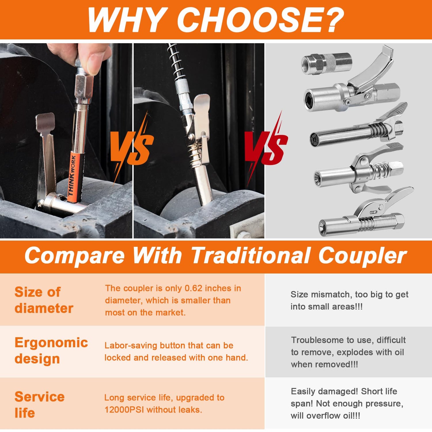 - Upgrade Locking & Sealing - With the exclusive patent in the United States, THINKWORK upgraded grease gun coupler adopts upgraded powerful patented 4-jaw structure. With reinforced jaws & high-quality aviation-grade sealing gaskets, Tested at 12000 PSI pressure also prevents leaks