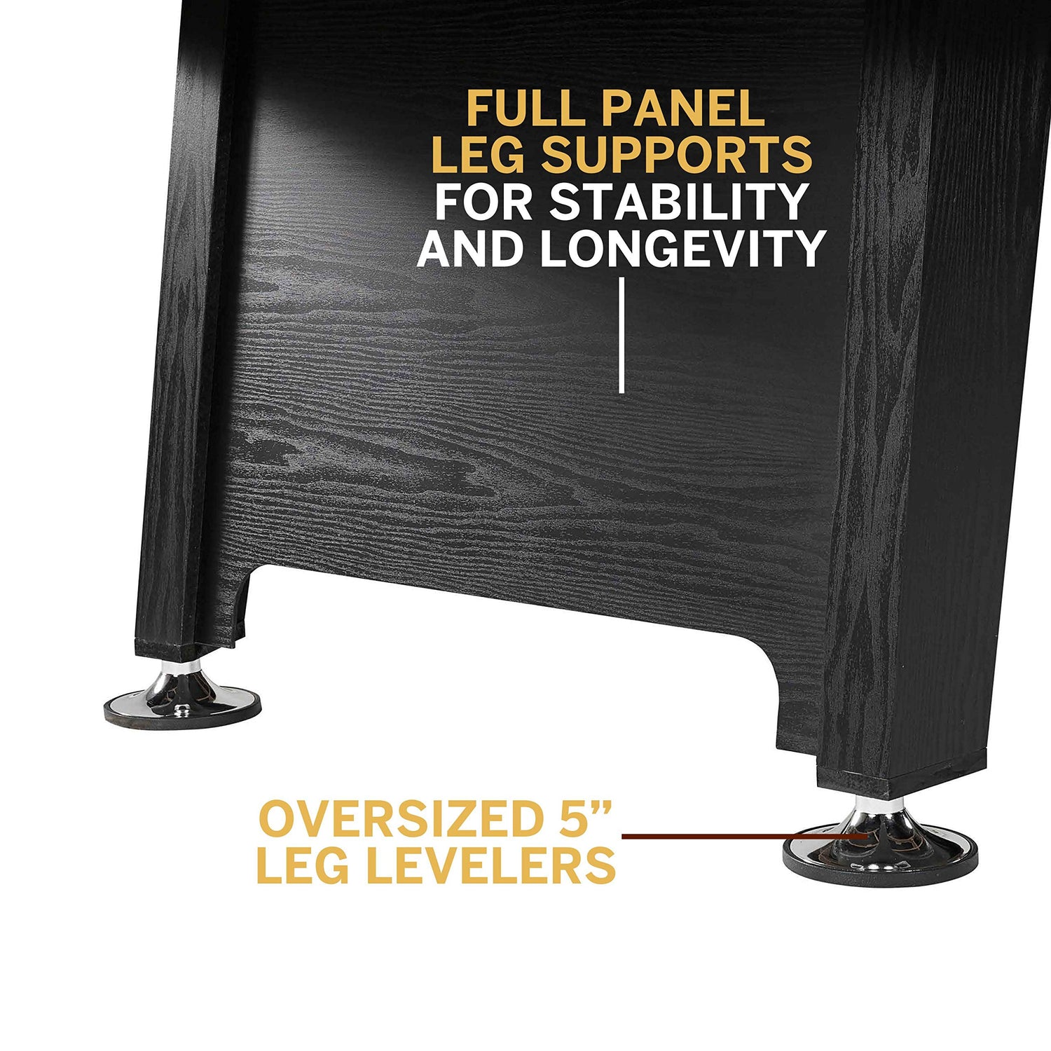 - STURDY LEG DESIGN: The table legs are made of MDF and laminated with a dark wood grain finish two leg panels give extra durability to the Modern style table. The legs have adjustable 5” oversized leg levelers and the table has 2 additional adjustable brackets under the playfield to help even the playing surface
