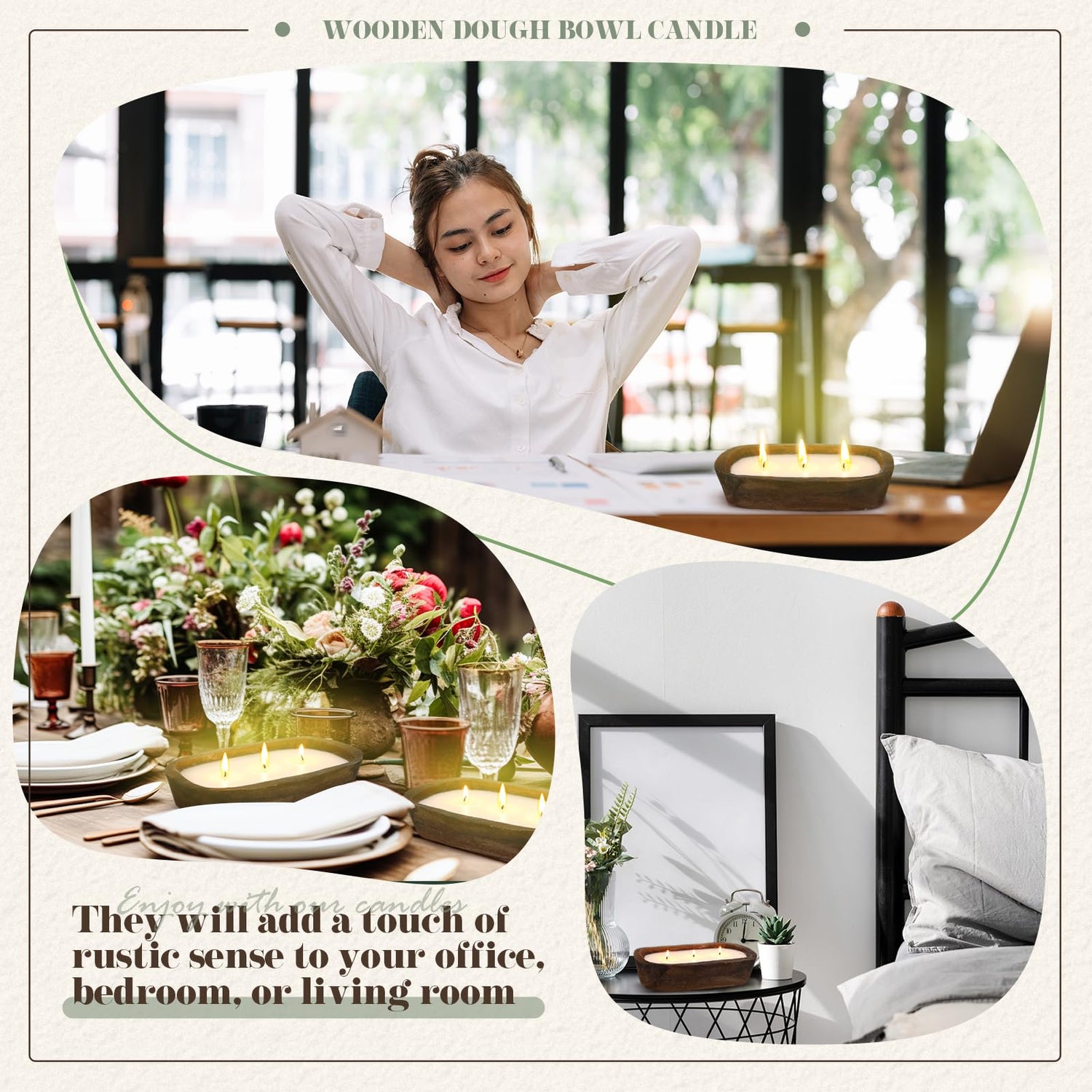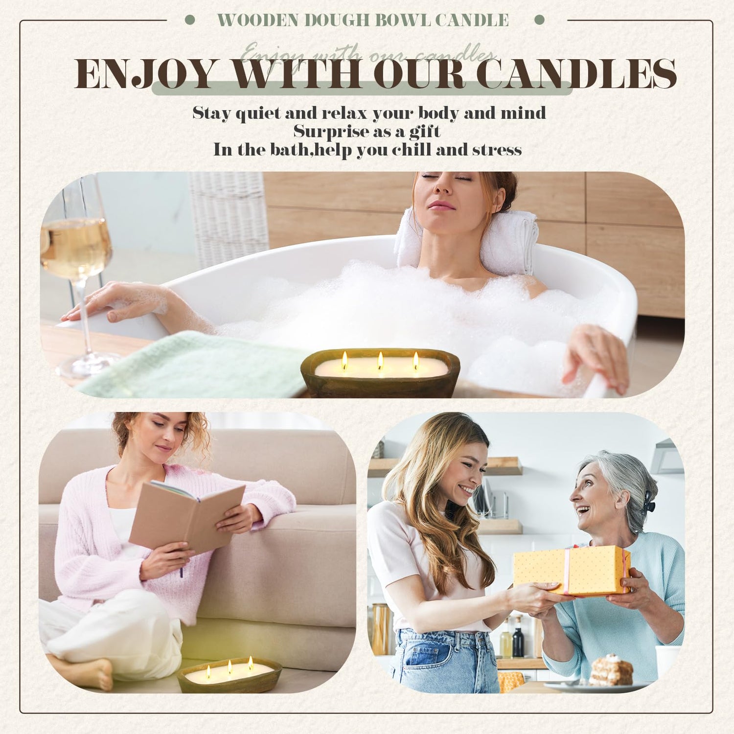- Crafted scented candles: our candle set includes two beautifully crafted wooden dough bowl candles, each designed with wick lights; Immerse yourself in the charm of these 3 wick candles, each releasing a captivating sage and eucalyptus scent that transforms your living space into a relaxing retreat. Note: Candle burning is affected by the actual temperature, if there is a partial depression of the candle, please keep the candle burning continuously, the surrounding candle will melt