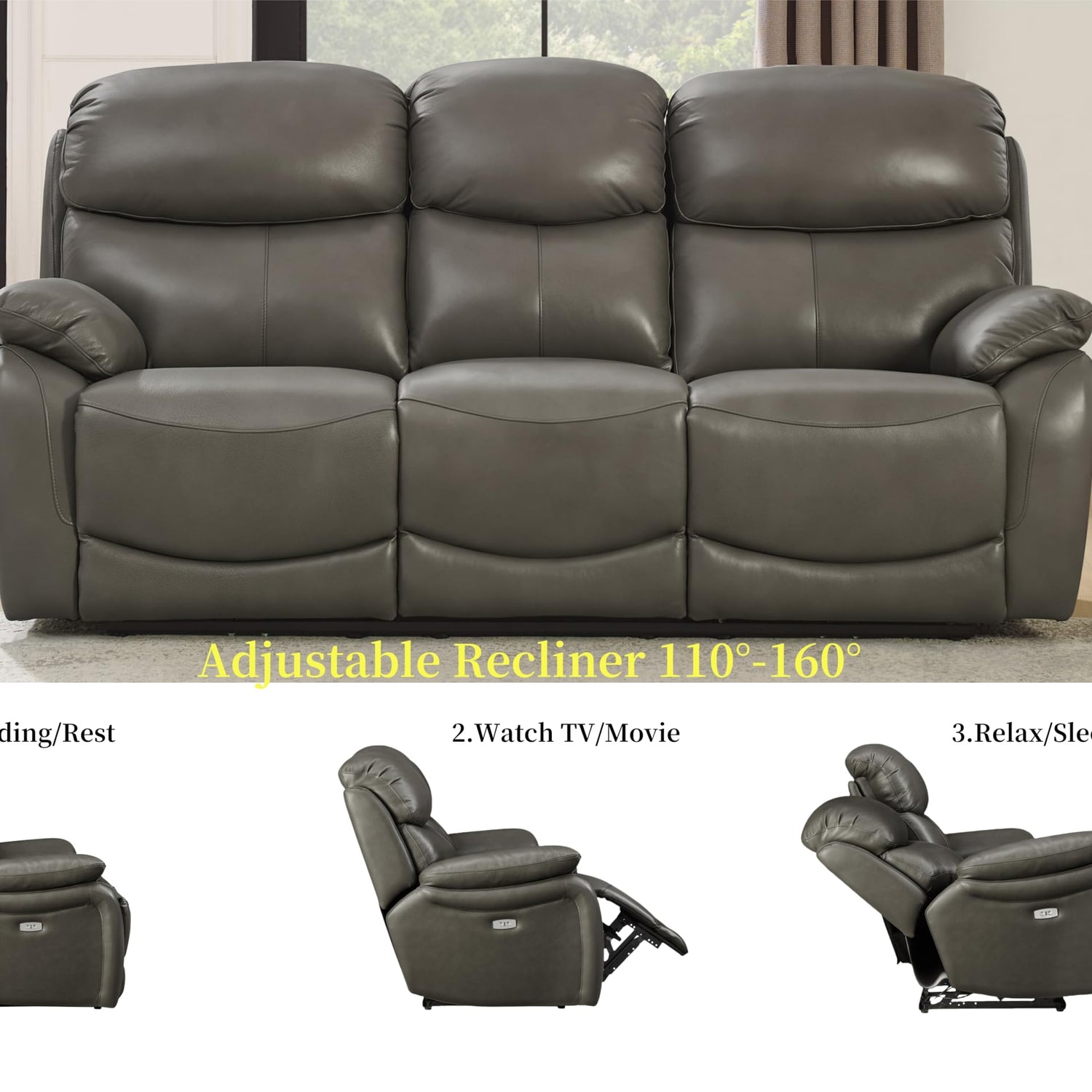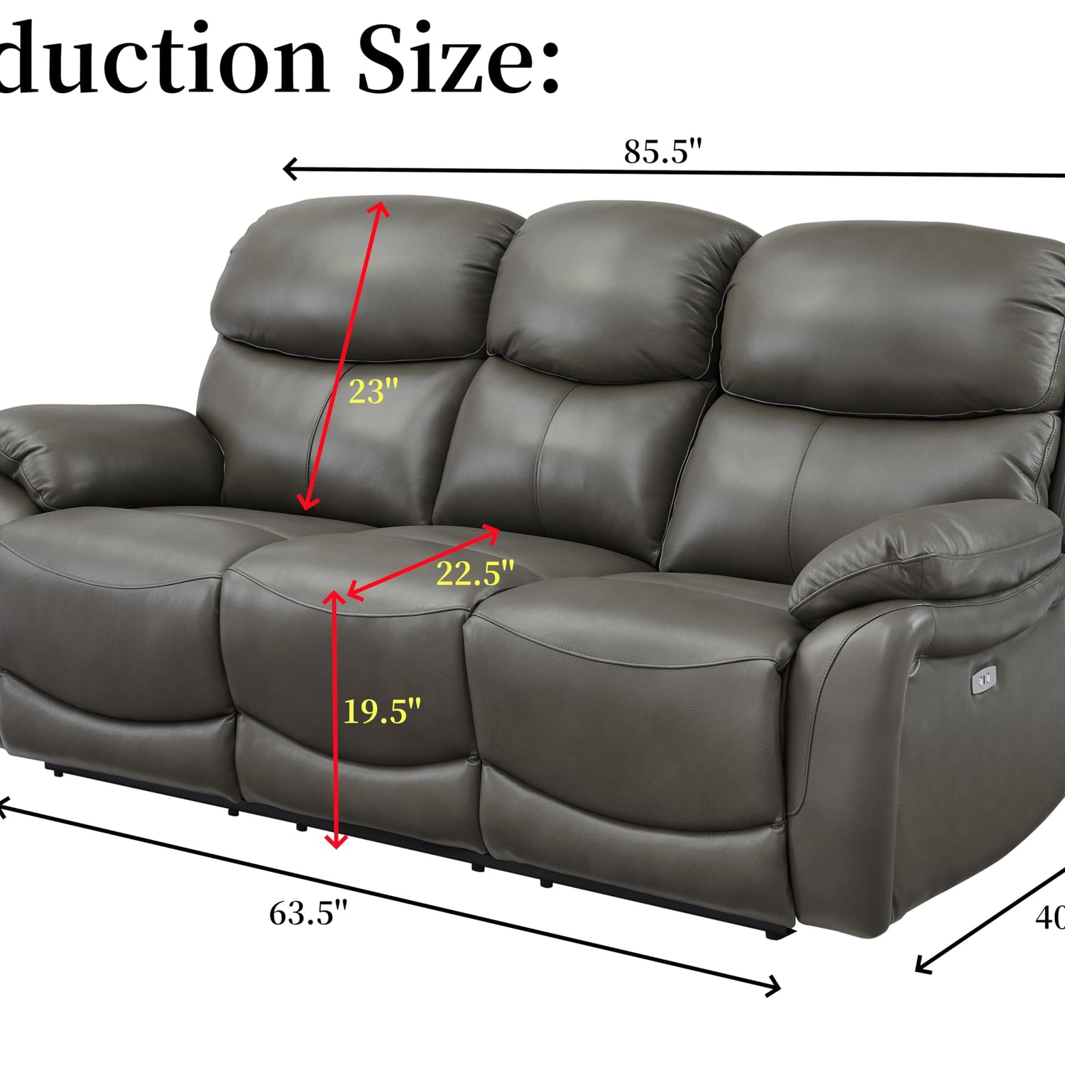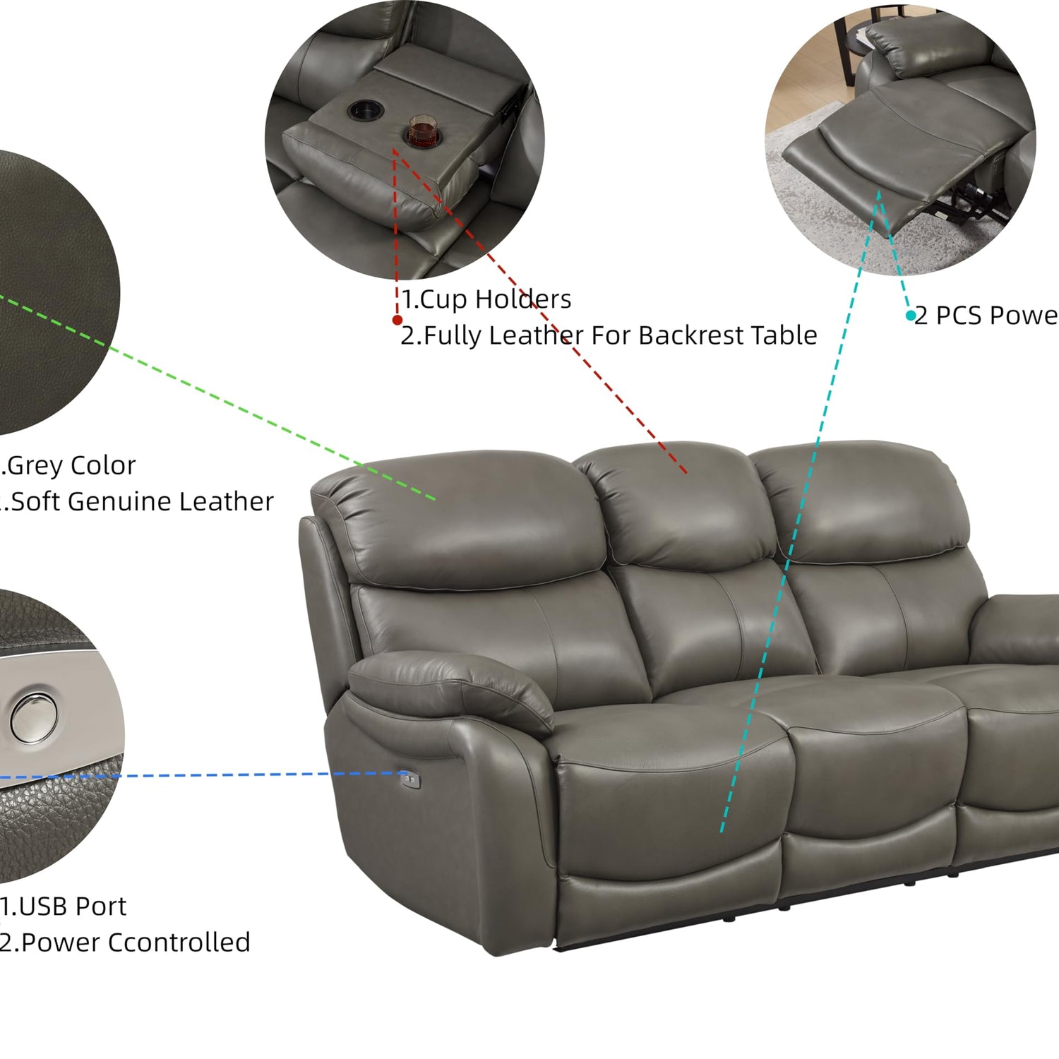 THSUPER Power Genuine Leather Recliner Sofa Couch with USB Port, Reclining Sofas Living Room Furniture, 3-Seats Couches with Cup Holders, Grey
