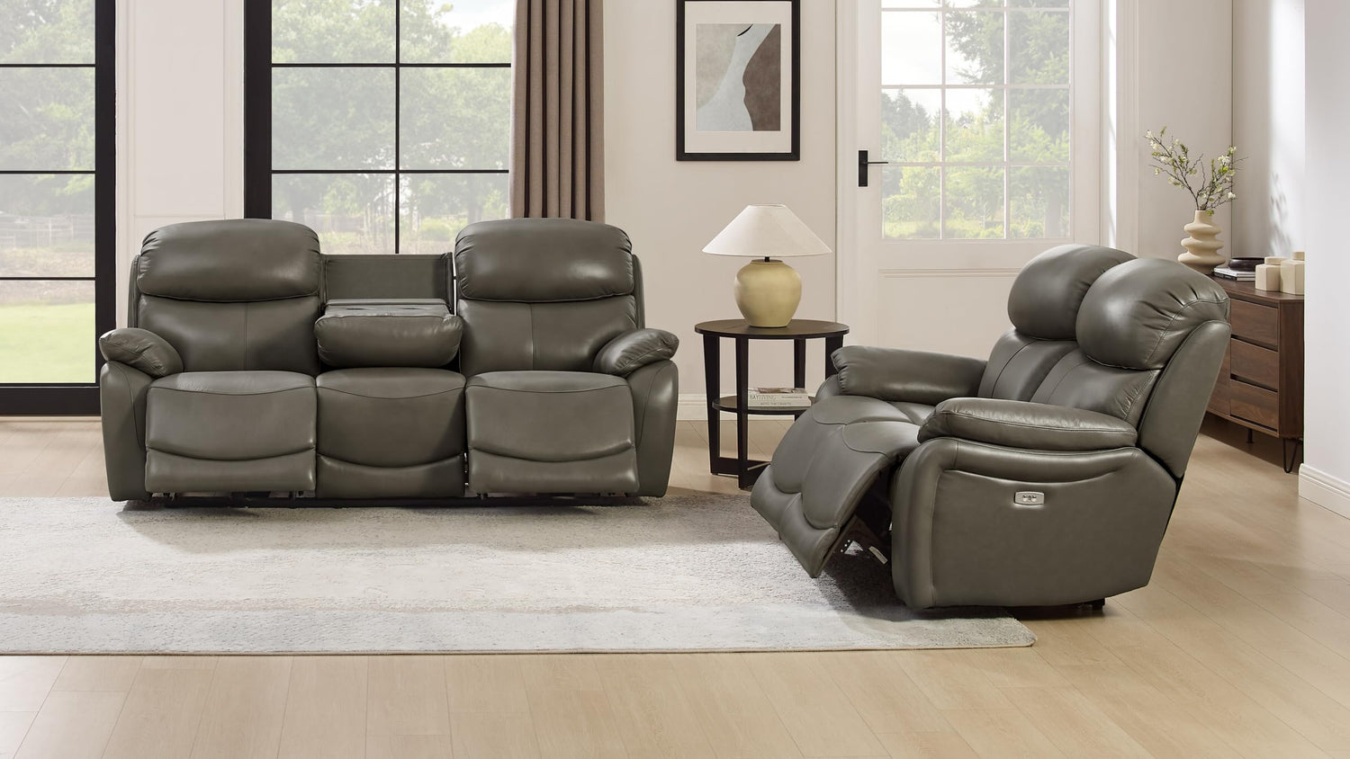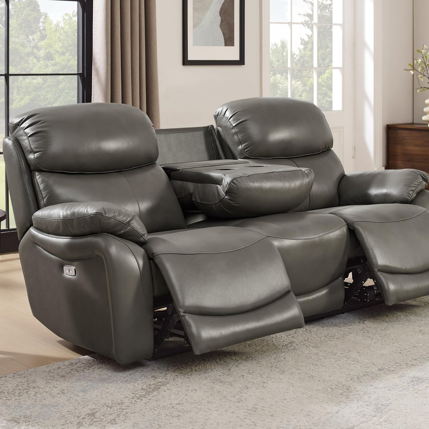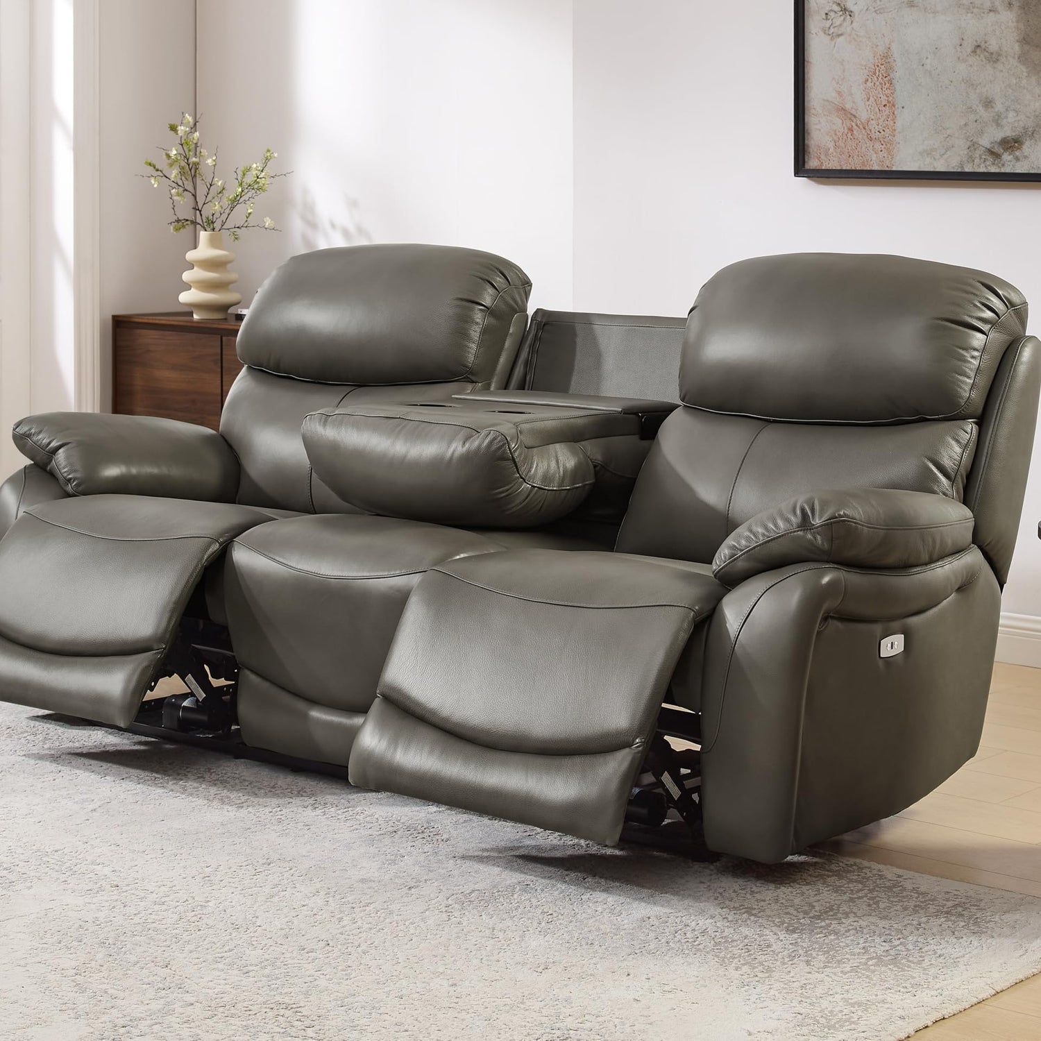 THSUPER Power Genuine Leather Recliner Sofa Couch with USB Port, Reclining Sofas Living Room Furniture, 3-Seats Couches with Cup Holders, Grey