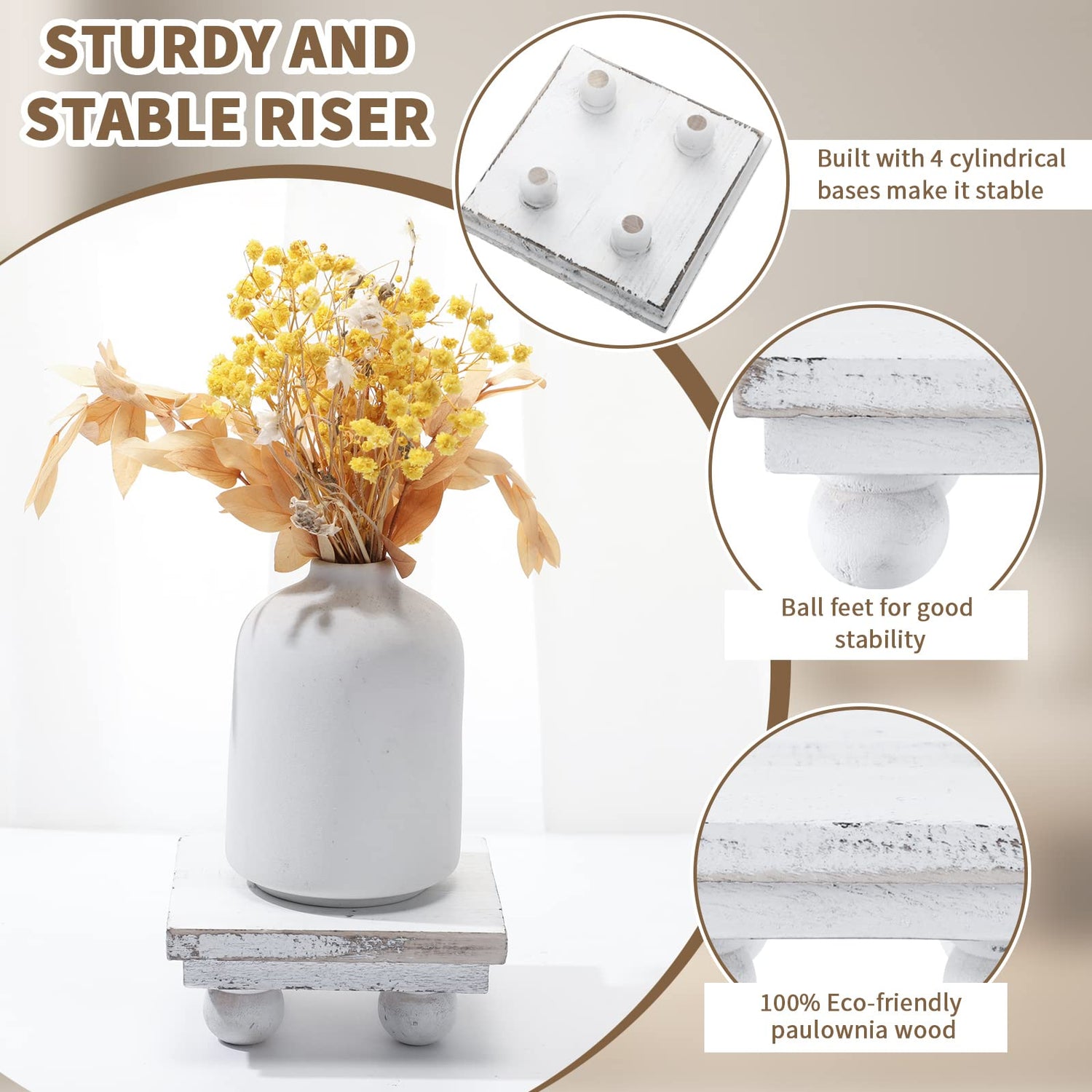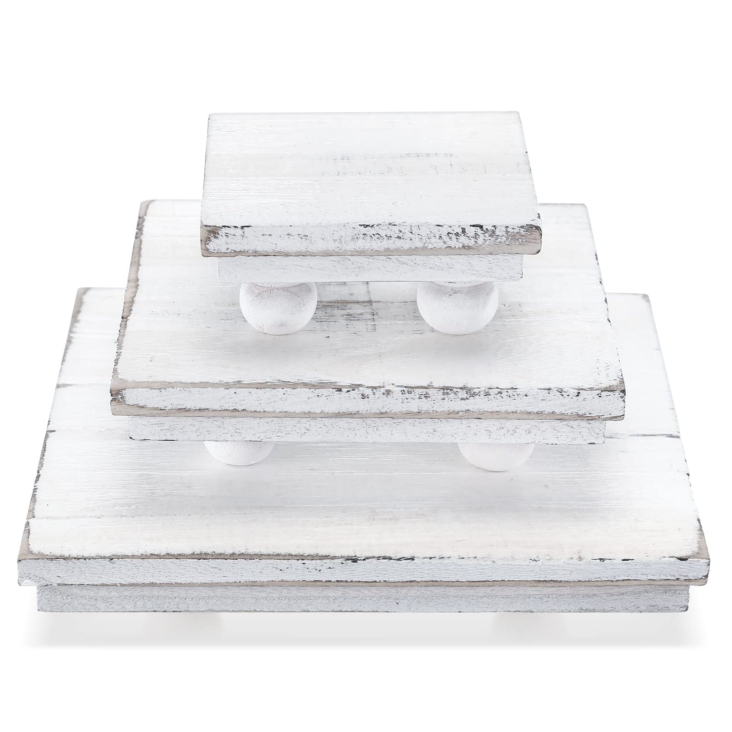 - Elegant and Rustic: wooden display risers are in distressed style, each of them is equipped with 4 lovely spherical feet, ensuring stability to hold your items, square white pedestal stand will blend well with your room decors and add an elegant and retro atmosphere to your home