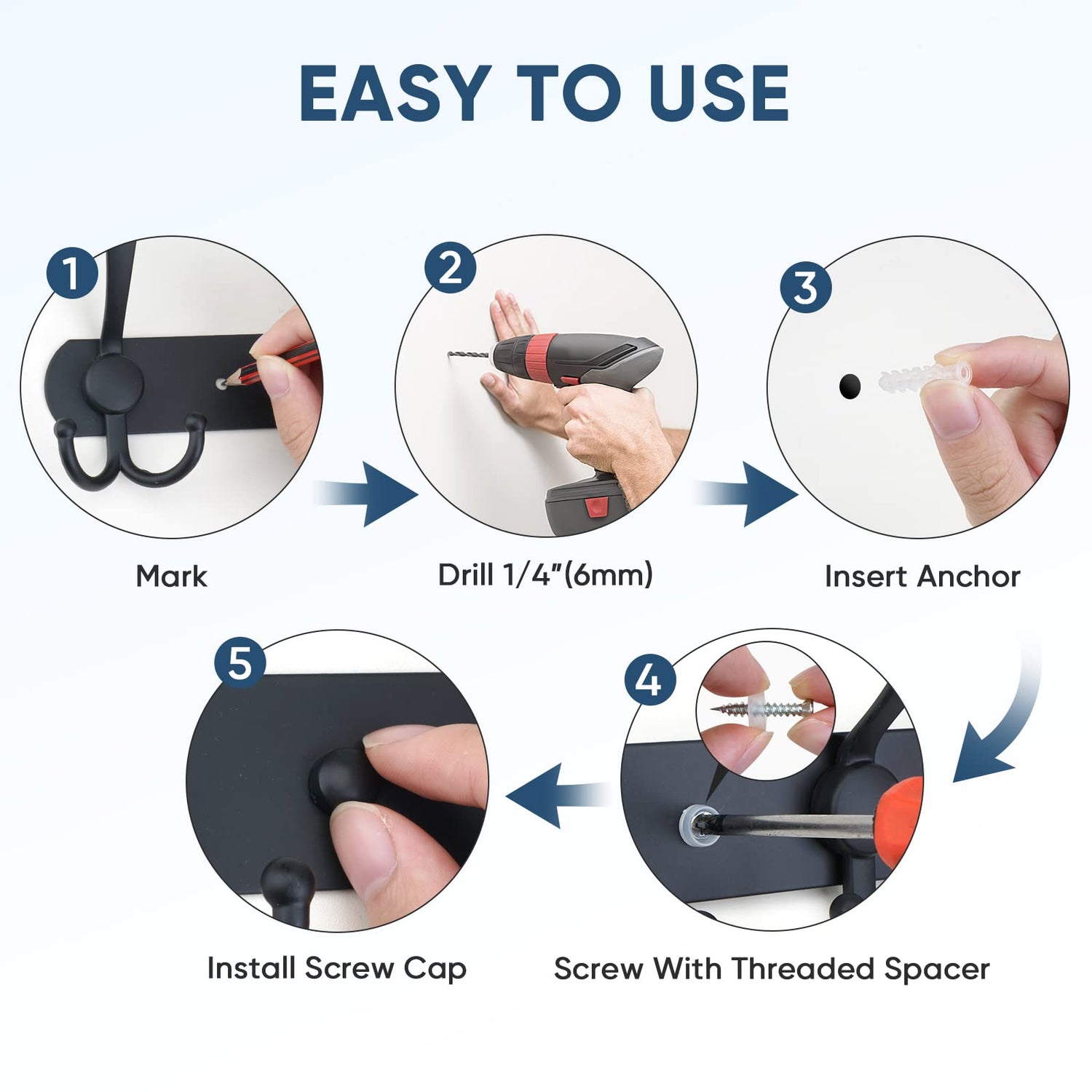 - [STYLISH & PRACTICAL DESIGN] All hook ends are rounded and smooth, preventing your clothing from tearing. 2 mounting screws are covered by caps with matching color. Unlike over the door hooks, our hanger can be installed at any height for easy access.