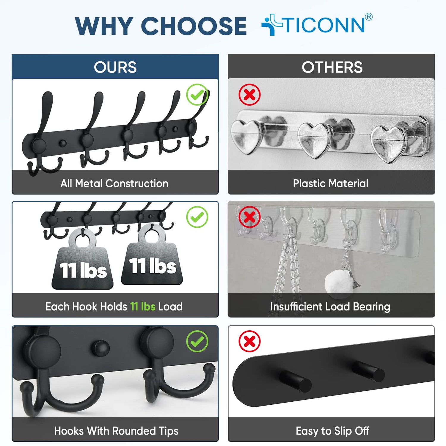 - [PREMIUM QUALITY] TICONN wall-mounted coat hanger built with premium material. With the combination of stainless steel backing plate and aluminum alloy hooks, each tri-hook can hold up to 11lbs.