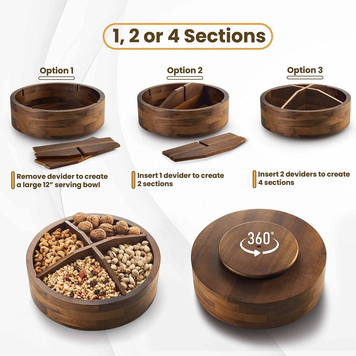 TIDITA 12" Acacia Lazy Susan Organizer with 4 Dividers - Wooden Lazy Susan Turntable for Table, Countertop - Kitchen Storage Food Bin Container for Spices, Cabinet, Fridge, Pantry (Acacia Wood)