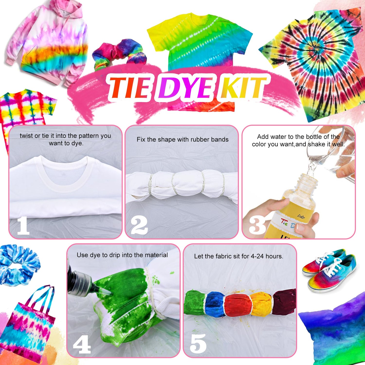 - FROM BLANK TO STYLISH - Easily create your own personality tie-dye projects by turning any natural fabric textile from blank to stylish with our complete fabric tie dye supplies set! Includes 40 bottles of vibrant tie dye, table cover, apron, rubber bands and gloves, everything you need!