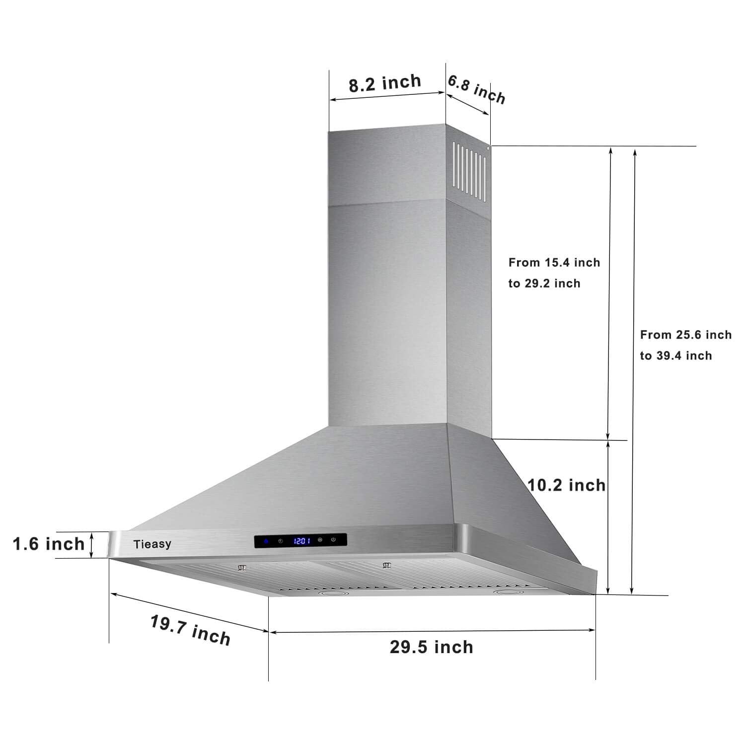 - PREMIUM QUALITY: Wall mount exhaust hood is made of hard 430 grade, 20-Gauge thickness brushed stainless steel is not easy to damage. Featured advanced touch screen allows you to easily control switches, 2 LED lights, 3 speeds air suction, even clock.