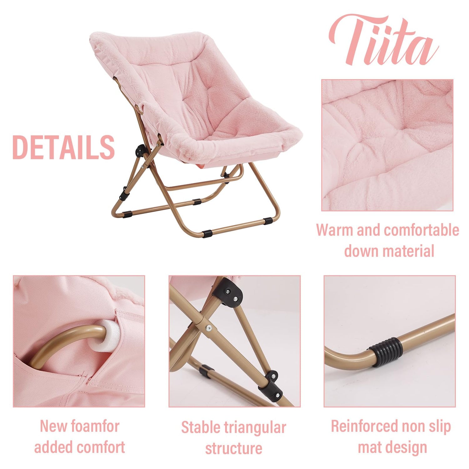 Tiita Comfy Folded Chair, Soft Faux Fur Oversized Folding Accent Chair, Lounge Lazy Chair for Kids Teens Adults, Metal Frame Moon Chair for Bedroom, Living Room, Dorm Rooms, X-Large Pink