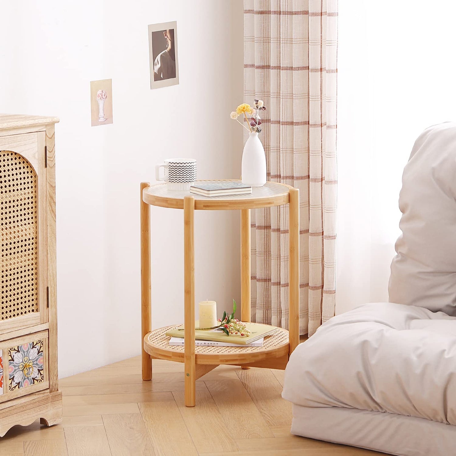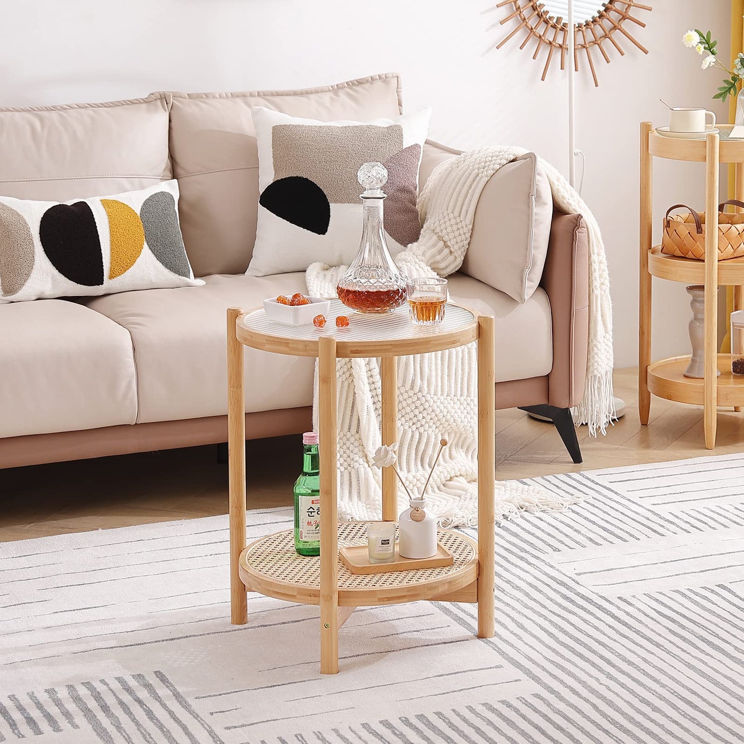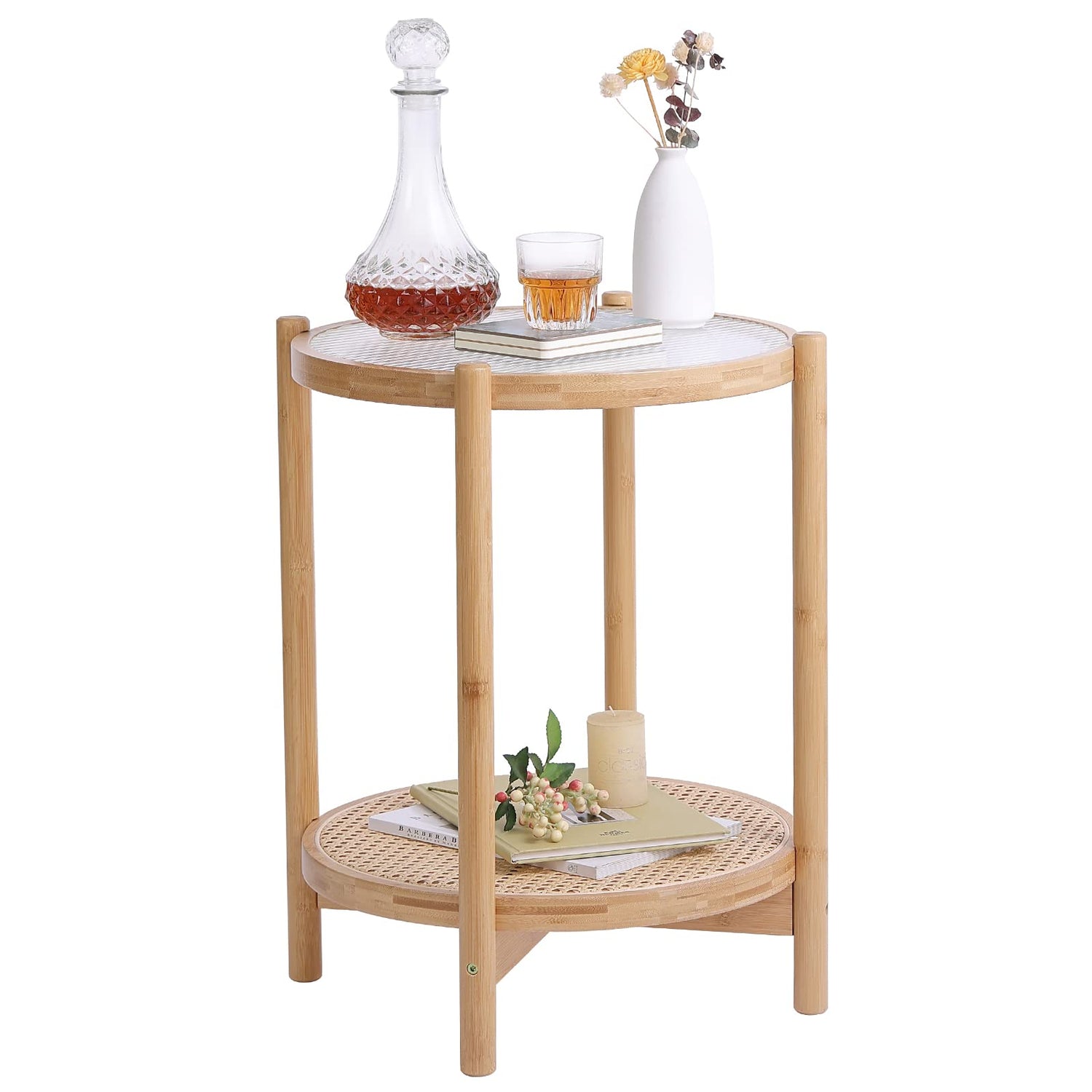 Tiita Rattan Coffee Table, Round End Table, 19.7Inch Modern Side Table, Small Bamboo Living Room Side Table, Glass Sofa End Table for Balcony and Office Outdoor/Indoor (Horizontal Stripe)