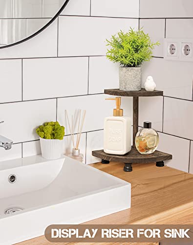 Tikea Decorative Wood Riser for Display, 2-Tier Rustic Corner Shelf for Kitchen Bathroom Counter Decor, Pedestal Stand for Soap Dispenser, Candle and Plant (Brown)