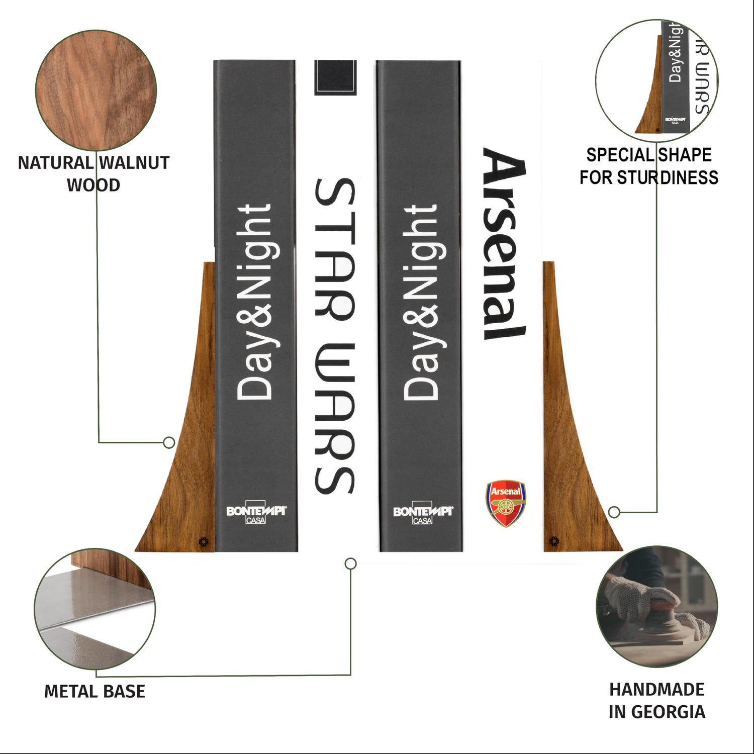 TILISMA Bookends, Walnut Wood with Metal Base - 2 Handmade Book Holders for Heavy Books - Decorative Accessories for Bookshelf Organization and Display
