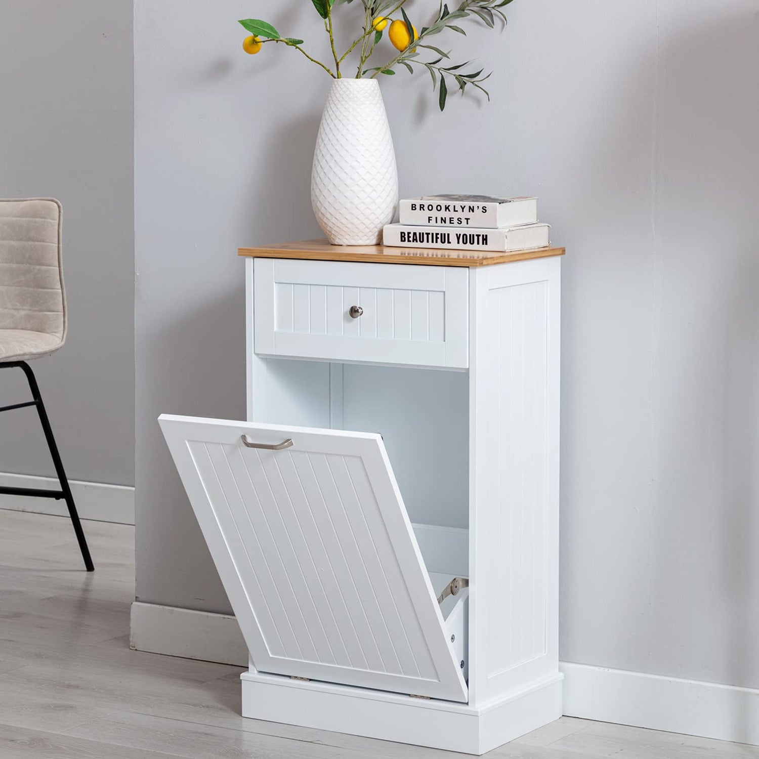 Tilt Out Trash Cabinet, Freestanding Wooden Kitchen Trash Recycling Cabinet with Drawer & Removable Cutting Board, Dog Proof Trash Can Cabinet, White