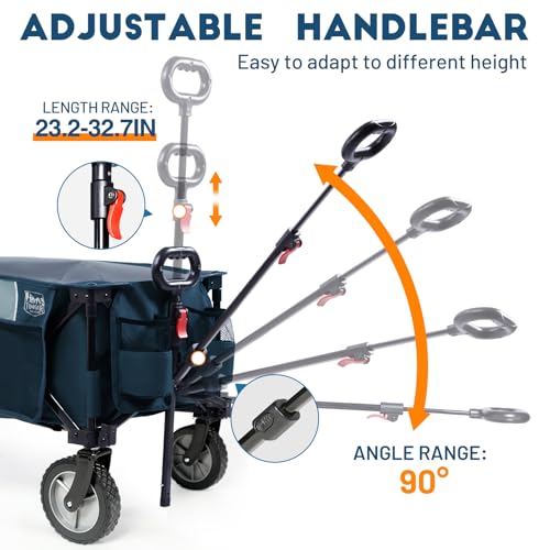 - 360° Rotating Wheels and Adjustable Handle: 360° rotating front wheels enable this wagon cart to move smoothly in any occasions, like camping, shopping and gardening; adjustable handle design can fit the need for different people.