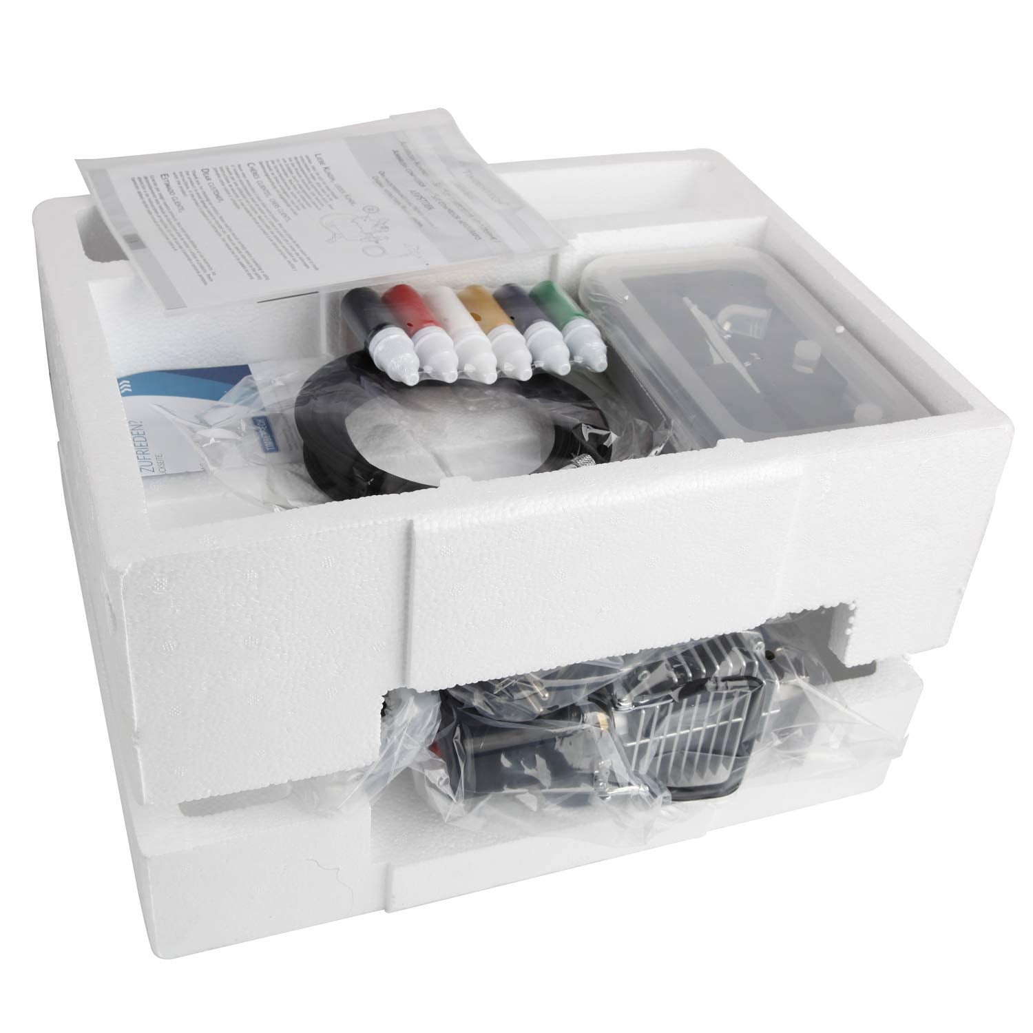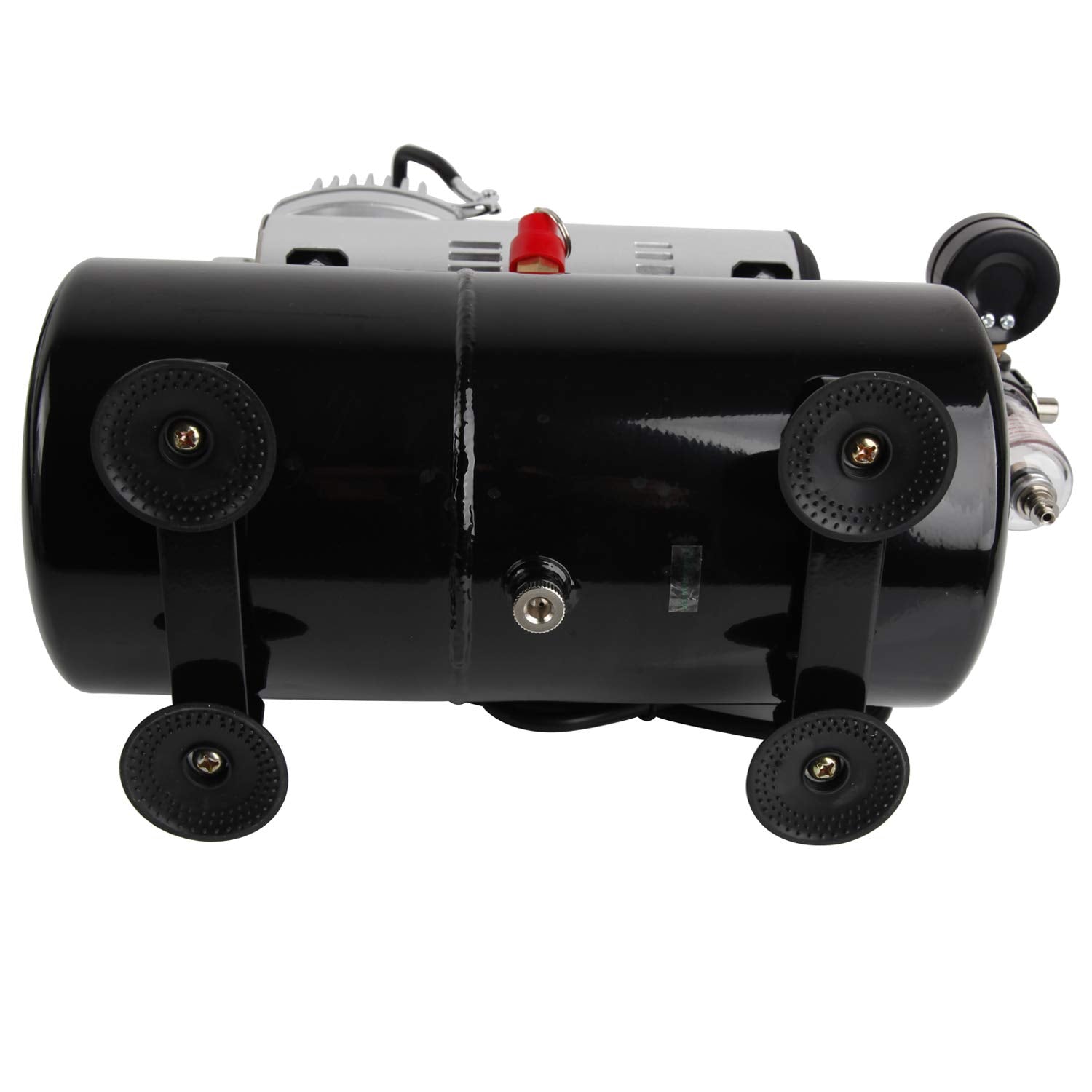 Powerful upgraded cooling oil-free piston compressor with air tank and automatic switch-off, including water separator, pressure gauge This compressor is suitable for beginners and meets the requirements of advanced airbrushers in the long term.