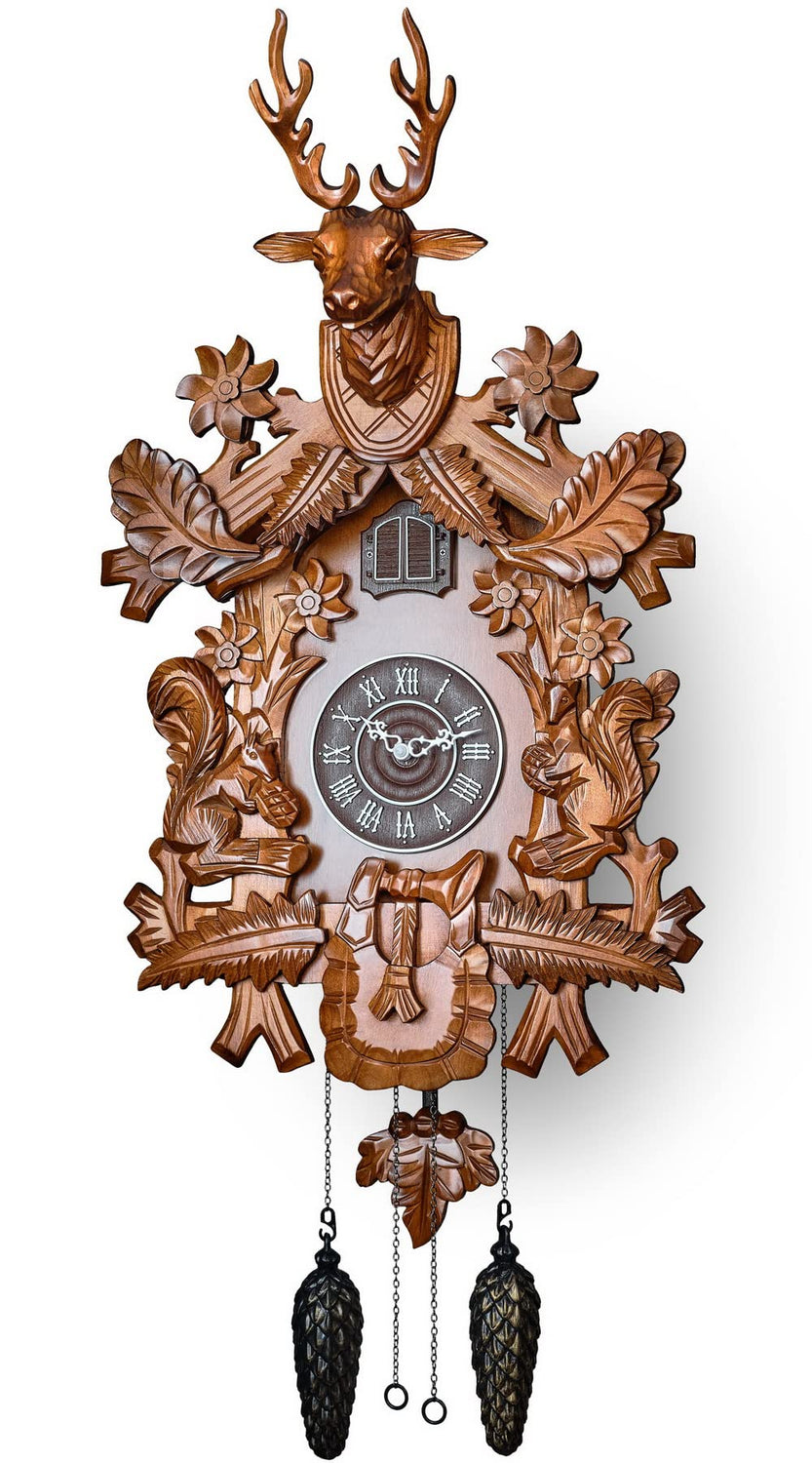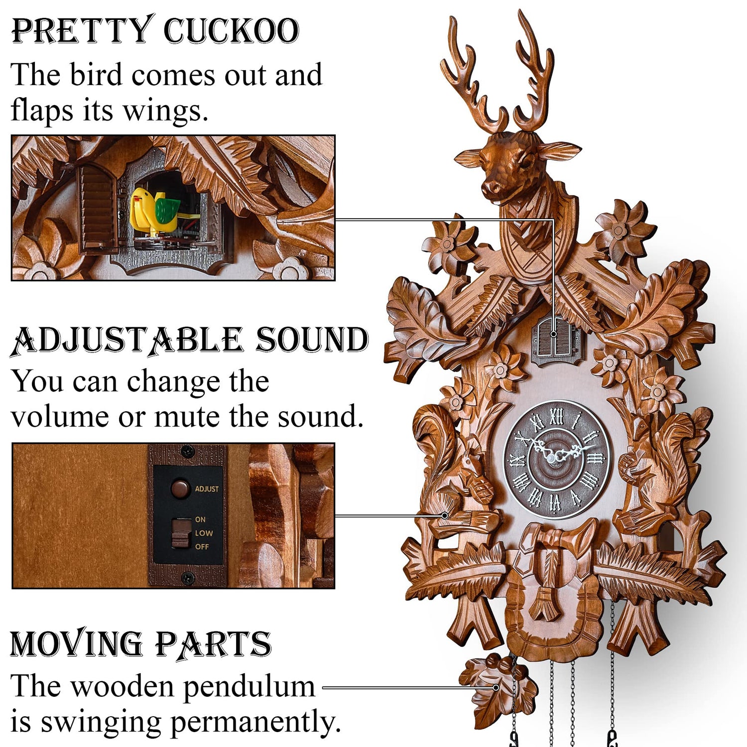 TIMEGEAR Cuckoo Clock with Automatic Night Mode, Hand Carved Deer Head and Wooden Decorations (Brown)