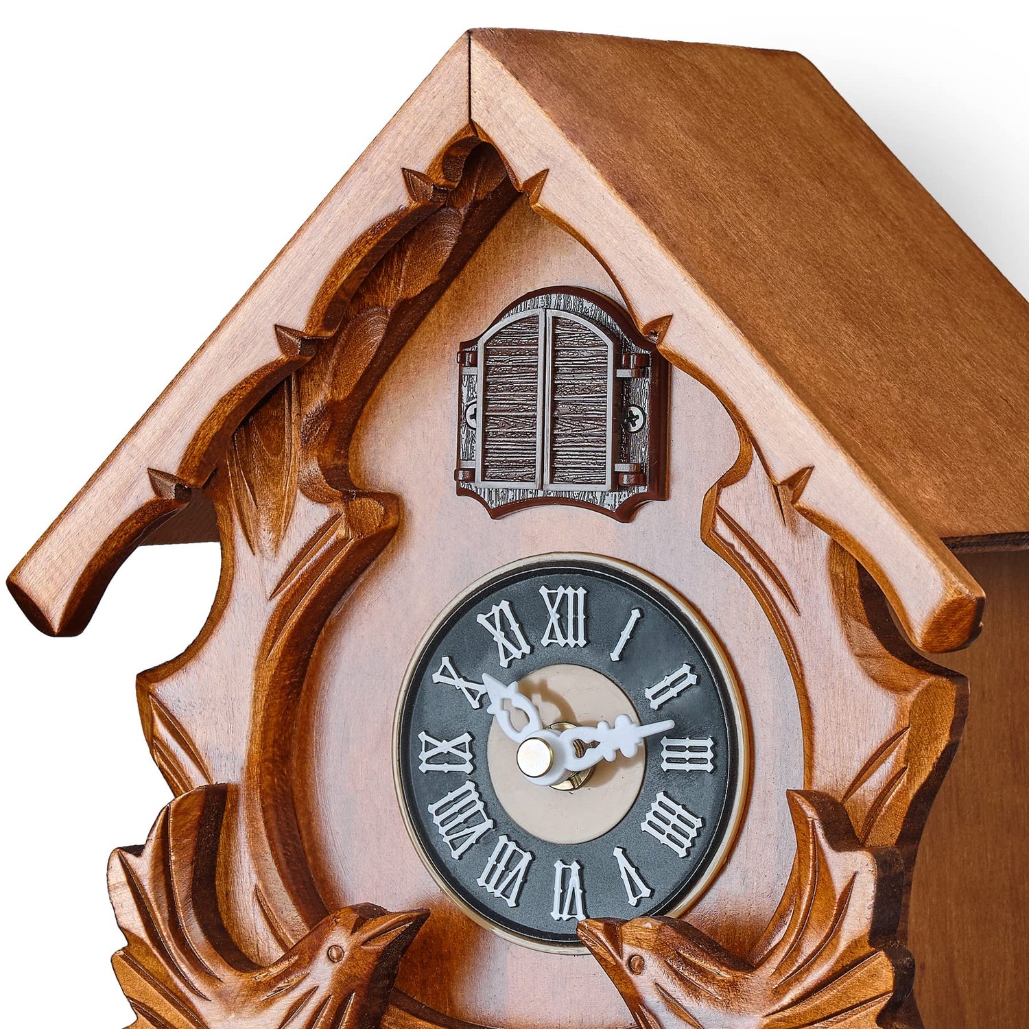 - ⭐ TRADITIONAL DESIGN and COMPACT SIZE: The cuckoo clock is decorated with hand carved wooden elements, showing scenes from the nature. SIZE: 9.6" (H) (not including the weights and pendulum) x 5"(W) x 7.5" (L).