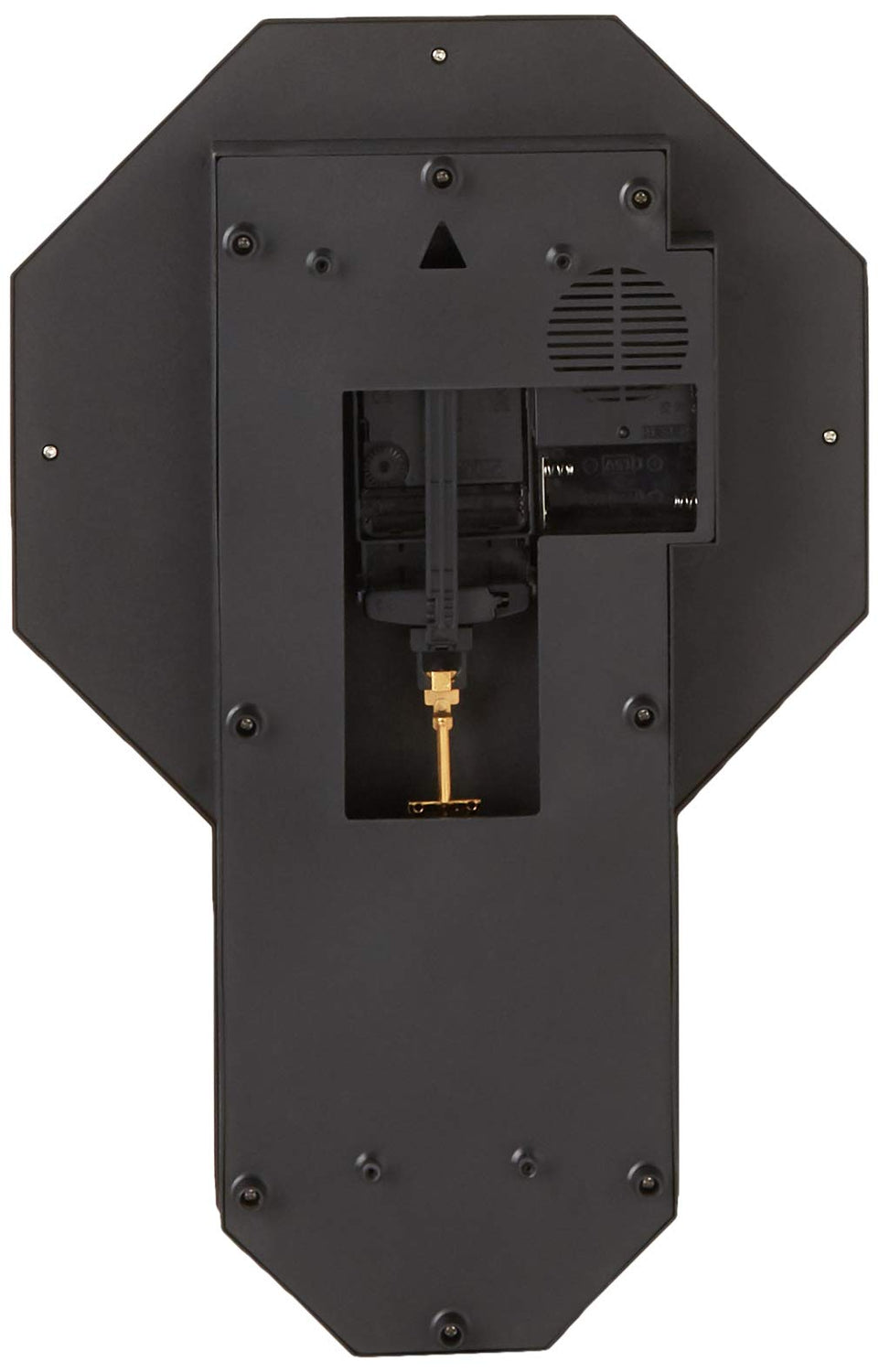 Details: Traditional style faux walnut wood clock with swinging gold pendulum and classic regulator emblem. Perfect for home and executive office environment. Peaceful and classic Westminster chime on the hour, perfect for work and rest. Elegant black metal hands, gold accents, and white dial provide a professional appearance to enhance rooms. The pendulum offers the classic chime and glass lens with a smooth and accurate sweeping second hand. Easy to install clock comes with hook for quick hanging and runs on AA batteries (sold separately). Clock measures at 17.5 in. x 11.25 in.
