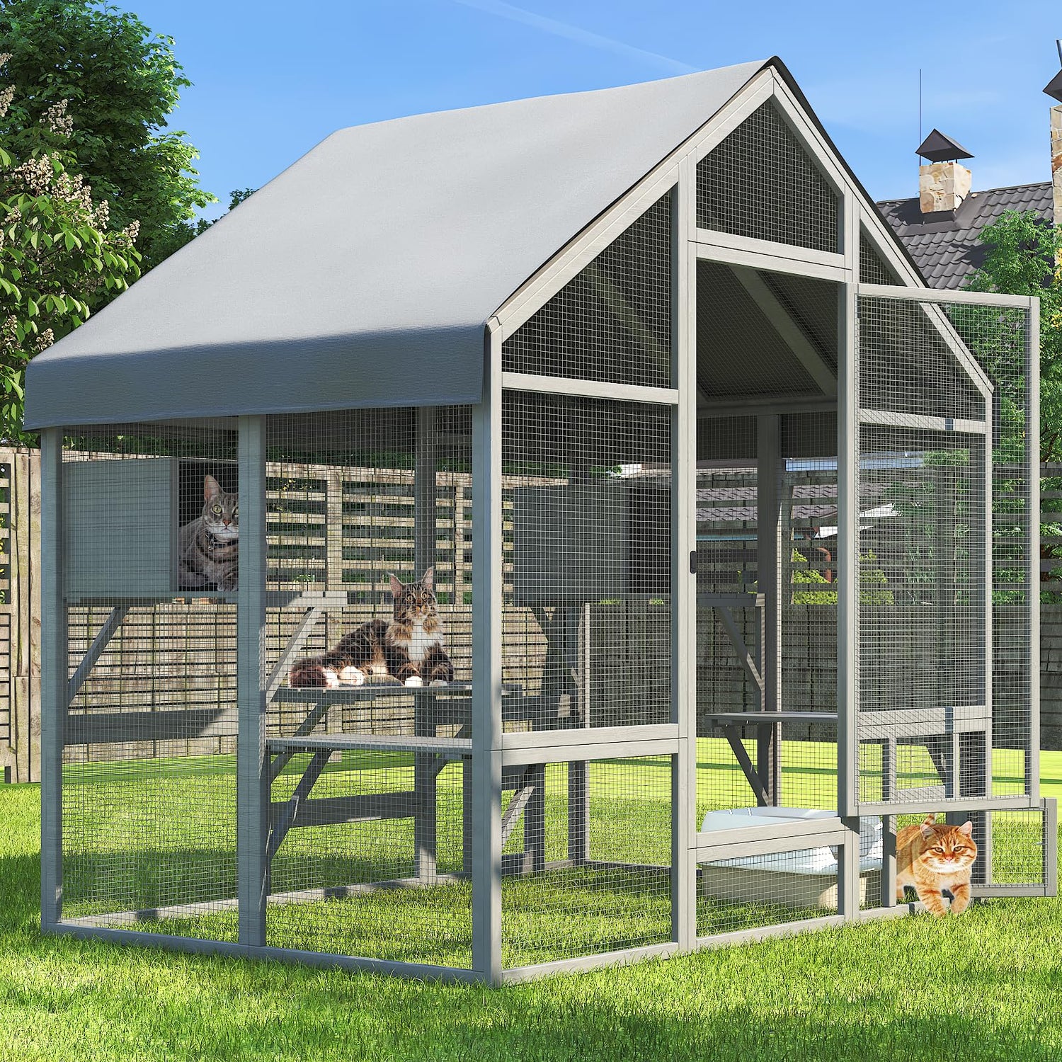 - 【Well-Designed Cat Catio】24.03ft² Outdoor cat enclosure include 2 x Resting Houses, 7 x Platforms, 2 x Small Door, 1 x Lager Door, allow cats to easily jump from left to right, giving your furry friends more space to climb and play, served as both a safe house and activity center