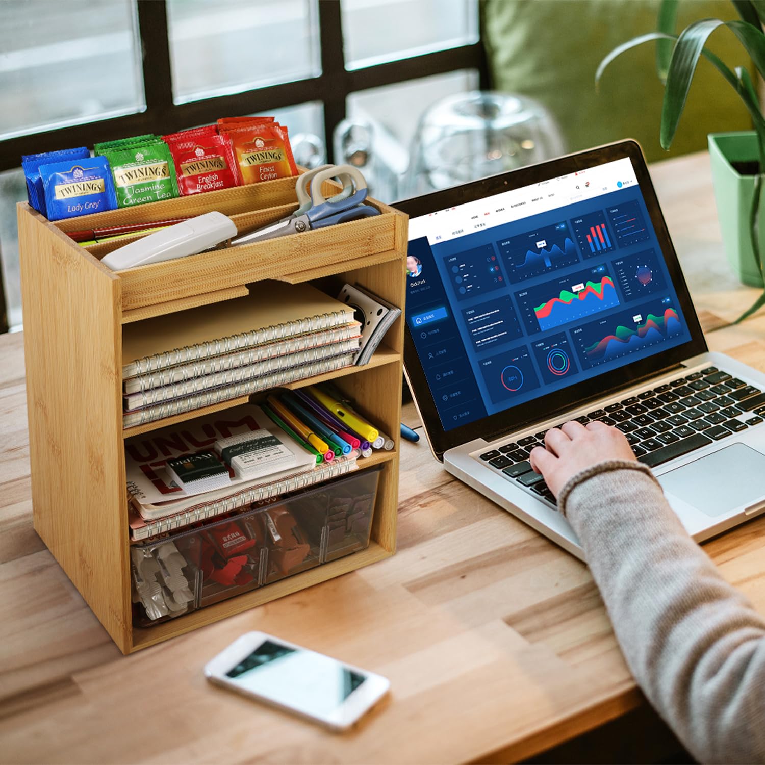 TIMIEEYA Tea Bag Organizer - Bamboo Tea Storage Organizer With Drawer 3 Layer, Tea Organizer for Tea Bags Natural Wood & Acrylic for Countertop Office Kitchen Cabinet Pantry