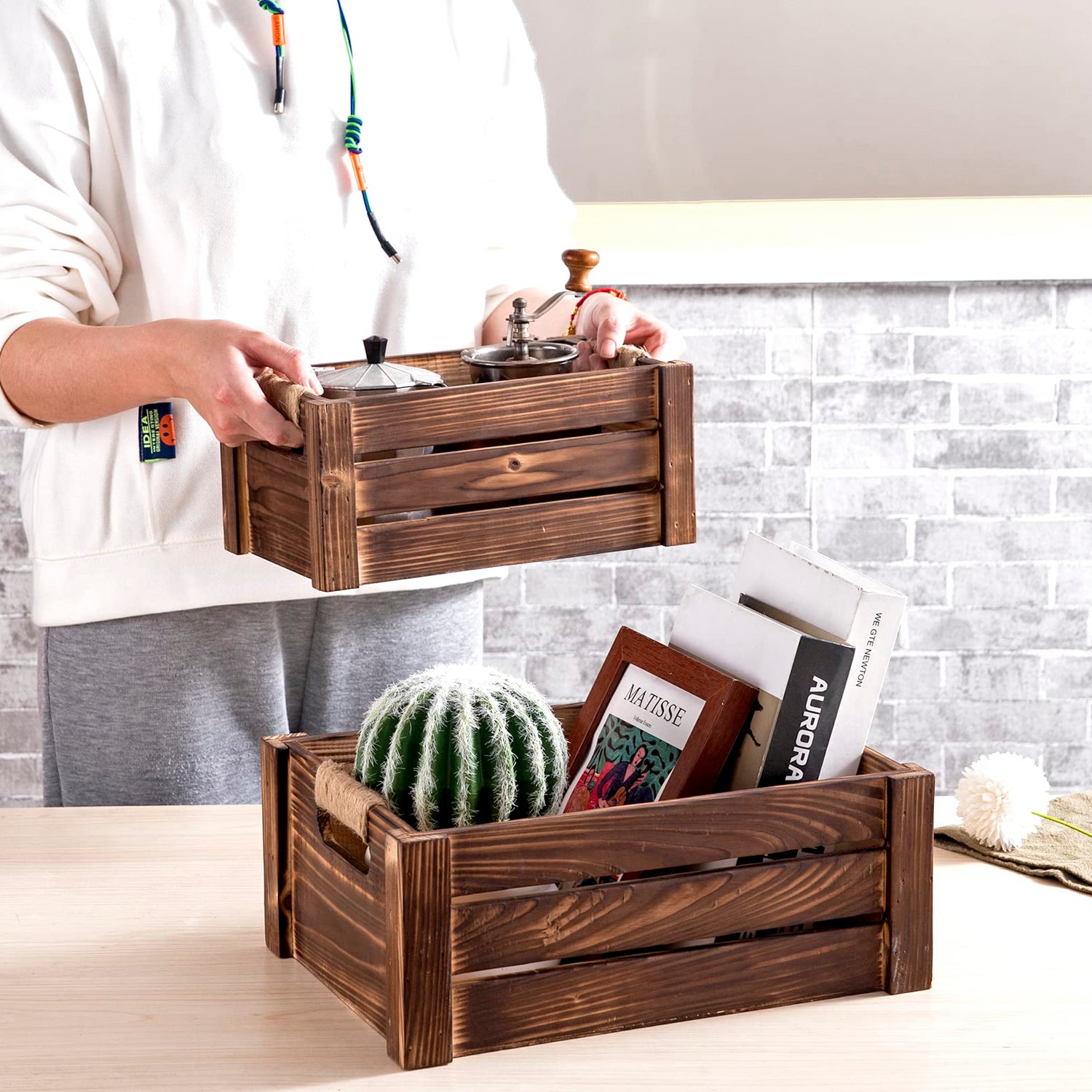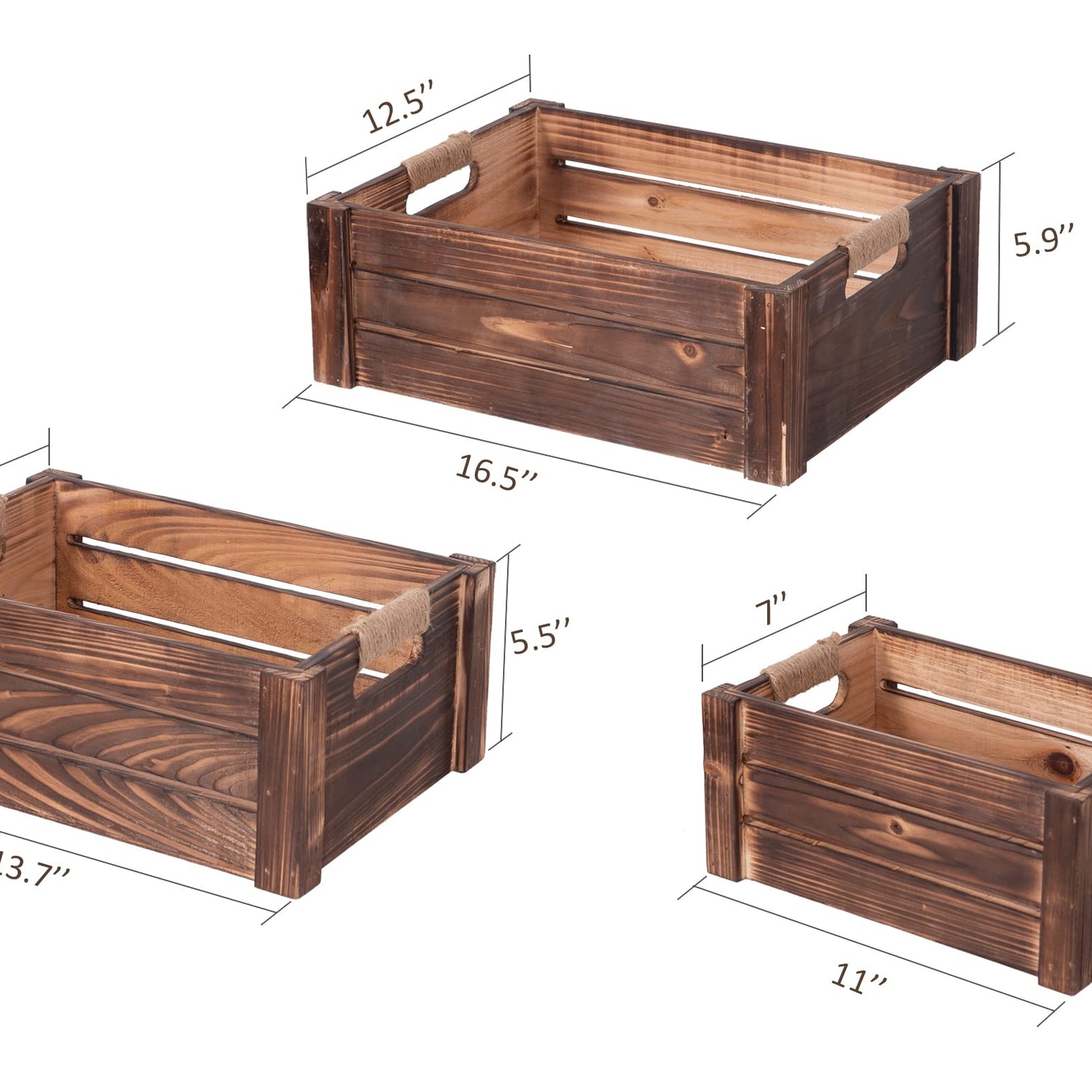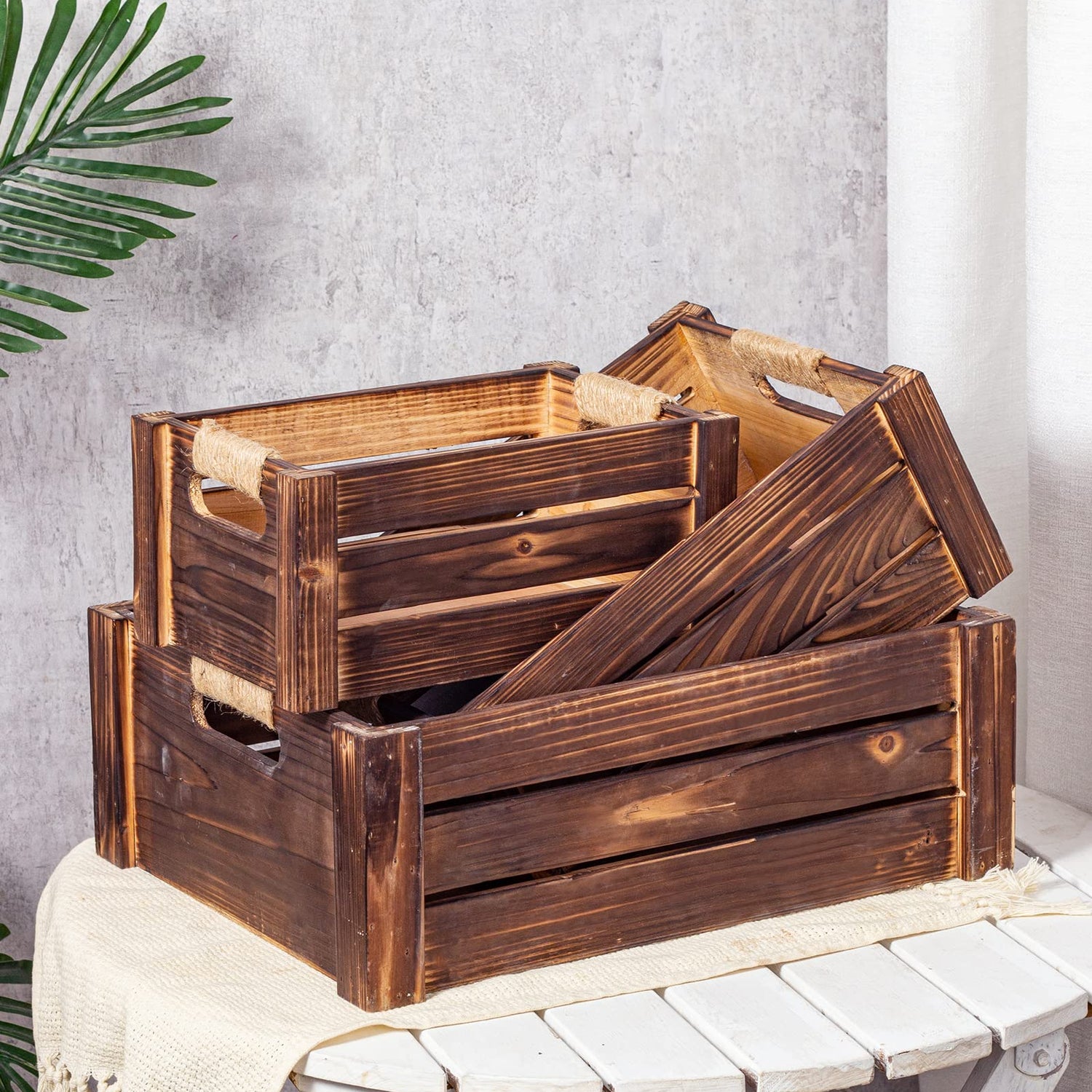 - UNIQUE DESIGN – The rectangular nesting crates have natural wood grain and knots on the surface, so each crate is unique, the farmhouse jute rope cutout handles make them easy to carry around.