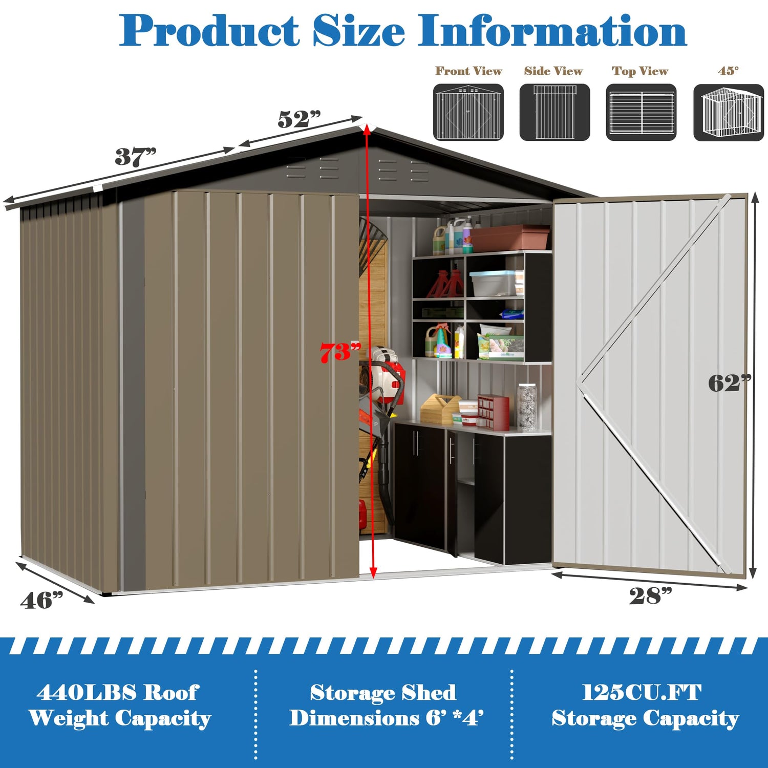 - Outdoor Storage Optimizer:This 6' × 4' FT shed measures 67"L x 46"W x 73"H, ideal for housing tools, bikes, and a lawnmower; Crafted for durability, this tool shed keeps your essentials organized and protected from the elements; You can also hang additional storage racks on the inside and outside of the metal shed to rationally optimize the storage shed space