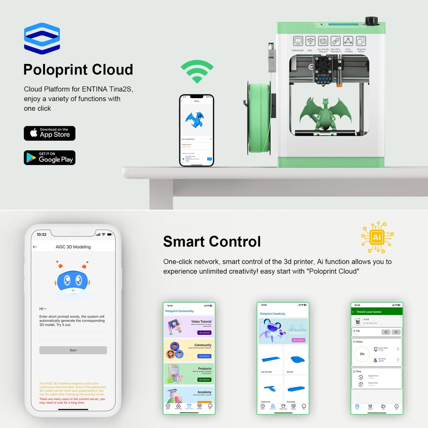 - 【Mini 3D Printers】:TINA2S - wifi 3d printer with App for beginners and kids, compact body, ready to use out of the box, fully assembled, no complicated settings to start printing, TF card and APP comes with multiple models, fully meet the printing needs of entry-level players, instantly start the perfect printing experience!