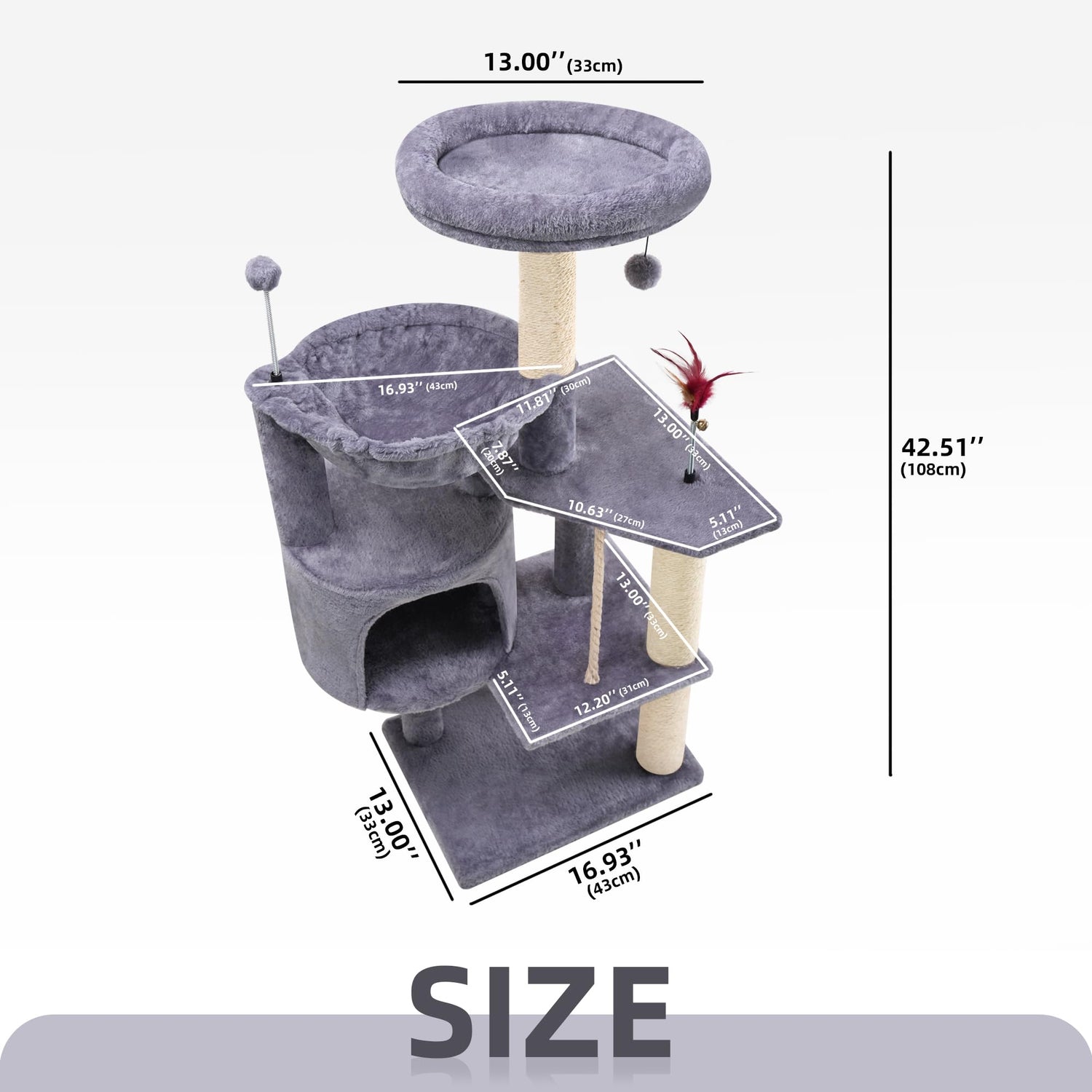 - 🐈【Multifunctional Design】 : Overall size:22.0"Lx17.7“Wx42.5"H.This cat tree is not only a climbing device, but also a comfortable sleeping platform, entertainment and play area, cozy cat condo and natural jute scratching posts. Meet the various needs of cats!