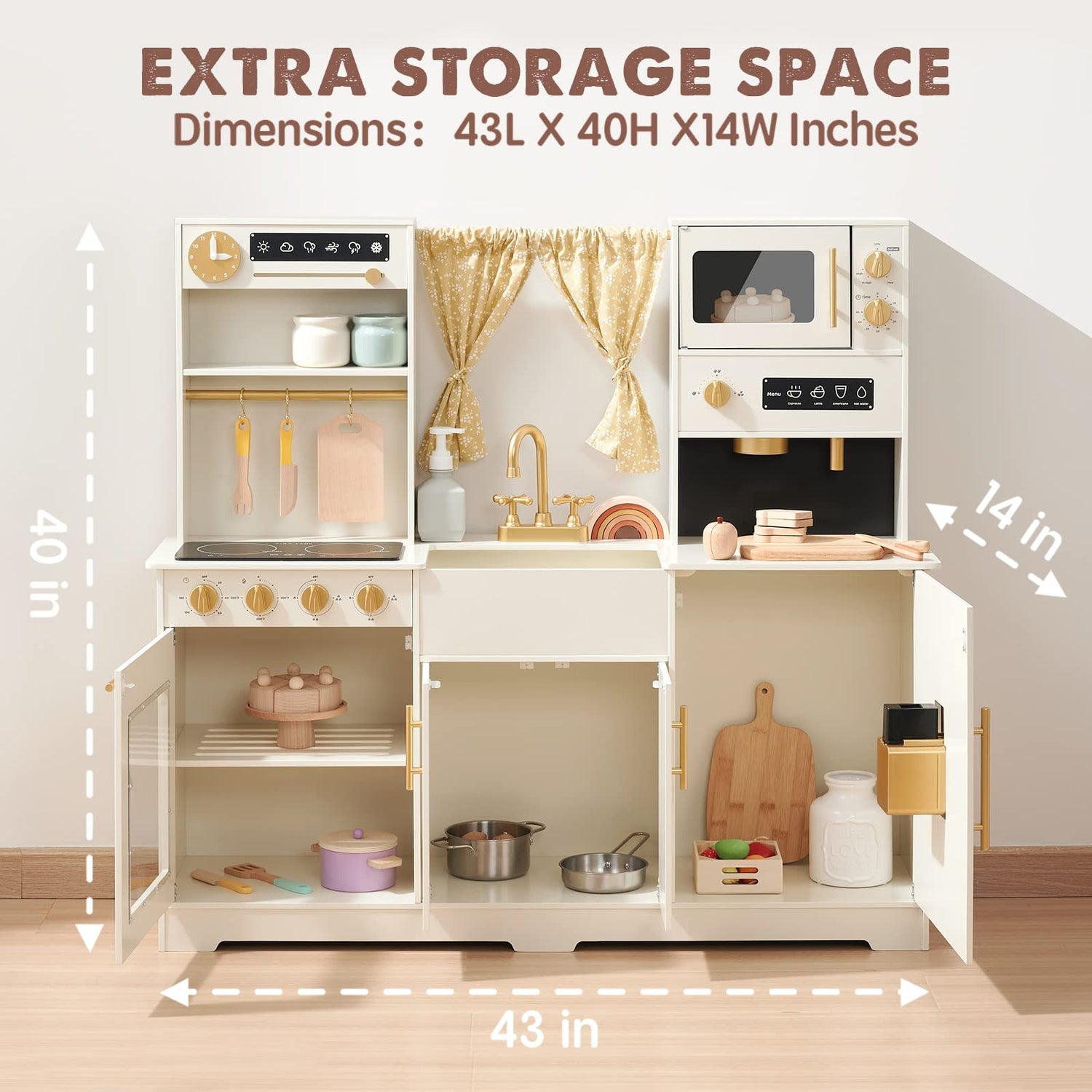 - 🌟Larger Operating Area: The upgraded play kitchen allows 3 children to play at the same time. Children can cut ingredients, organize ingredients or place other toy kitchen accessories on the work surface. The dimensions of the toy kitchen are: 43L x 40H x 14W Inches and the countertop height is 22 Inches.