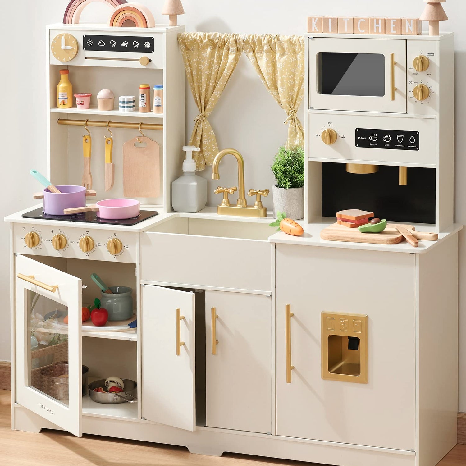 Tiny Land Play Kitchen for Kids, Toy Kitchen Set with Plenty of Play Features, New Modern Kids Wooden Play Kitchen Designed in Trendy Home Style with Curtains, Gift for Ages 3+