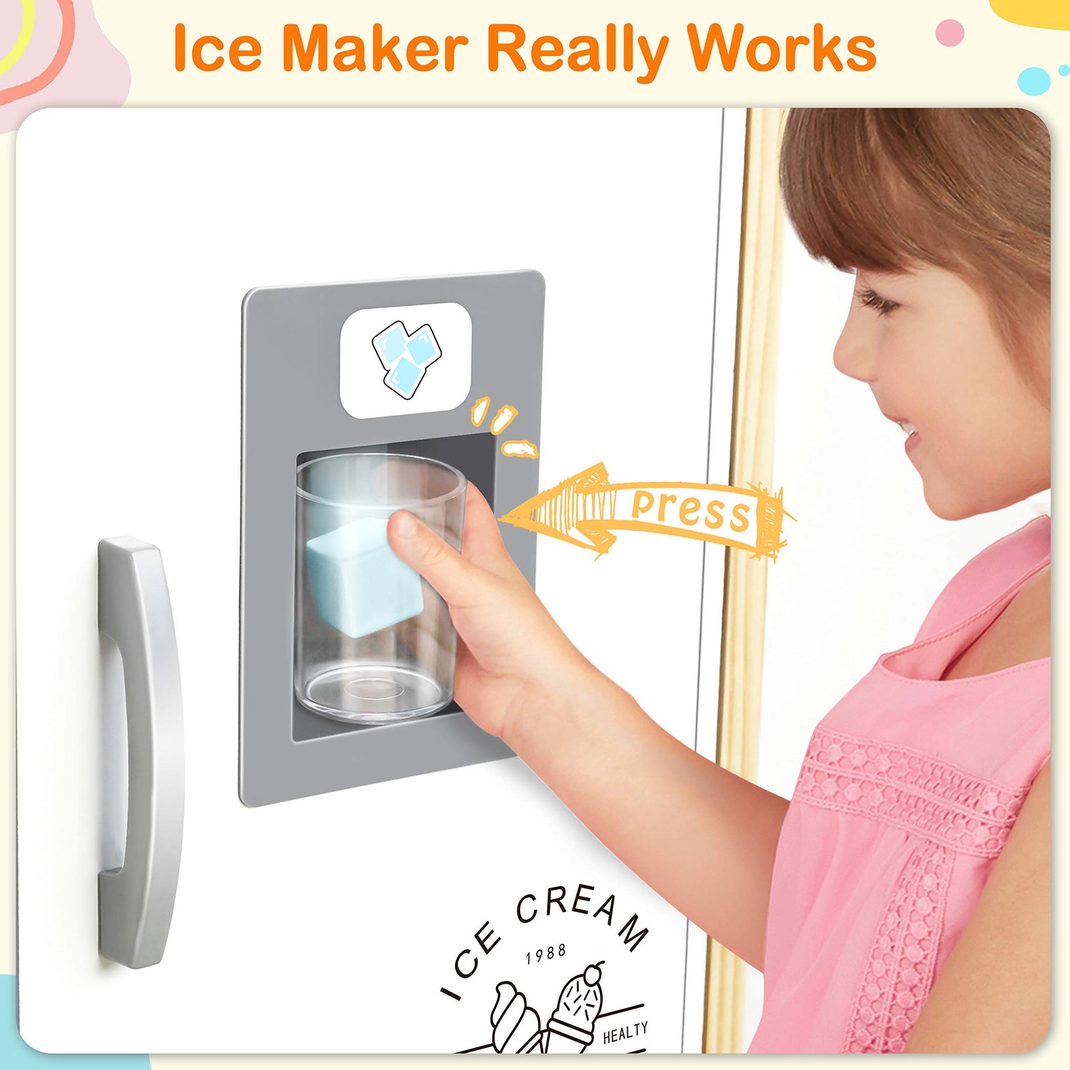 - ⭐Lots of Playable Features: The new model stove and range hood have a sim-life sound and lights with button control and automatically turn off. Kids would get endless fun with this playable oven, refrigerator, microwave oven, faucet, and removable sink.